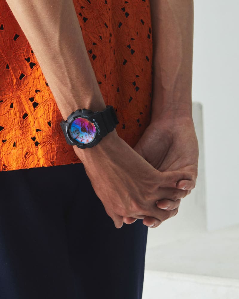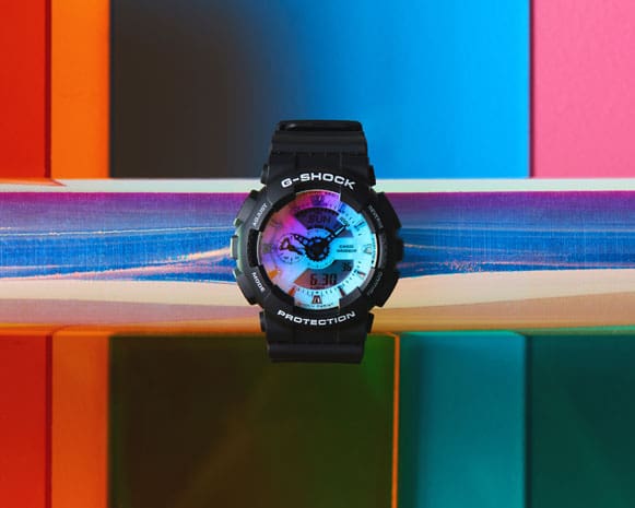 La G-SHOCK parfait sa démarche d'innovation en matière de verre avec la collection Iridescent Color composée de cinq montres aux teintes arc-en-ciel expressives, déclinées en noir mat et translucide. La série revisite les modèles DW-5600SR-1, DW-5600SRS-7, GA-110SR-1A, GA-2100SR-1A et GA-2100SRS-7A avec une finition cristal dégradée qui change selon la luminosité.