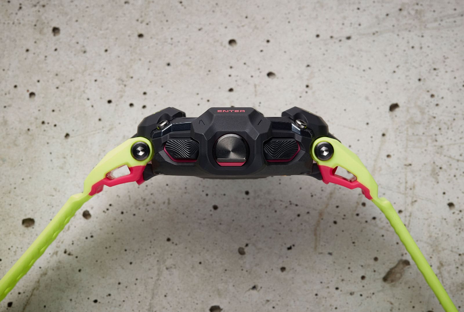 Outre cette réduction de la taille du produit, Casio a également concentré son attention sur le design. Bien que conservant la robustesse de l'extérieur de la G-Shock, Casio a adopté une nouvelle conception à cadre croisé. Inspirée de la structure utilisée dans les casques de moto de route et les chaussures de sport, celle-ci offre une résistance aux chocs accrue par la combinaison de pièces rigides et souples. La GBD-H2000 intègre cette conception à cadre croisé autour des boutons du boîtier et sur le bracelet. L'association de couleurs confère au design un sentiment de légèreté et de durabilité. La taille du corps principal n'est pas la seule à avoir été revue, l'amplitude de mouvement du bracelet l'ayant également été afin de créer un modèle pouvant être porté confortablement par tous, quelle que soit la taille du poignet.