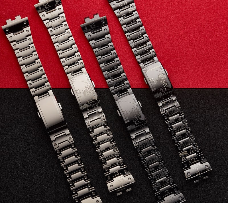 L'association de la texture mate du motif original de carte de circuit imprimé et de la texture brillante de la TranTixxii™ est l'essence de la GMW-B5000TCC et représente une nouvelle évolution du concept CMF. Comme nous l'avons vu par le passé lorsqu'un motif camouflage était exprimé en combinant des points de différentes tailles, l'expression du plein potentiel de la gravure au laser offre de nombreuses autres possibilités en termes de design. D'autre part, l'application du concept CMF au métal trouve constamment de nouvelles possibilités d'expression, comme le montre par exemple l'ajout de textures à l'aide du processus de forgeage. Les applications du concept CMF de la G-SHOCK risquent de s'accélérer à l'occasion du 40e anniversaire de sa naissance. Il est impossible de ne pas rester à l'affût des créations de Casio et de ne pas se demander combien de nouveaux designs innovants seront présentés à l'avenir.