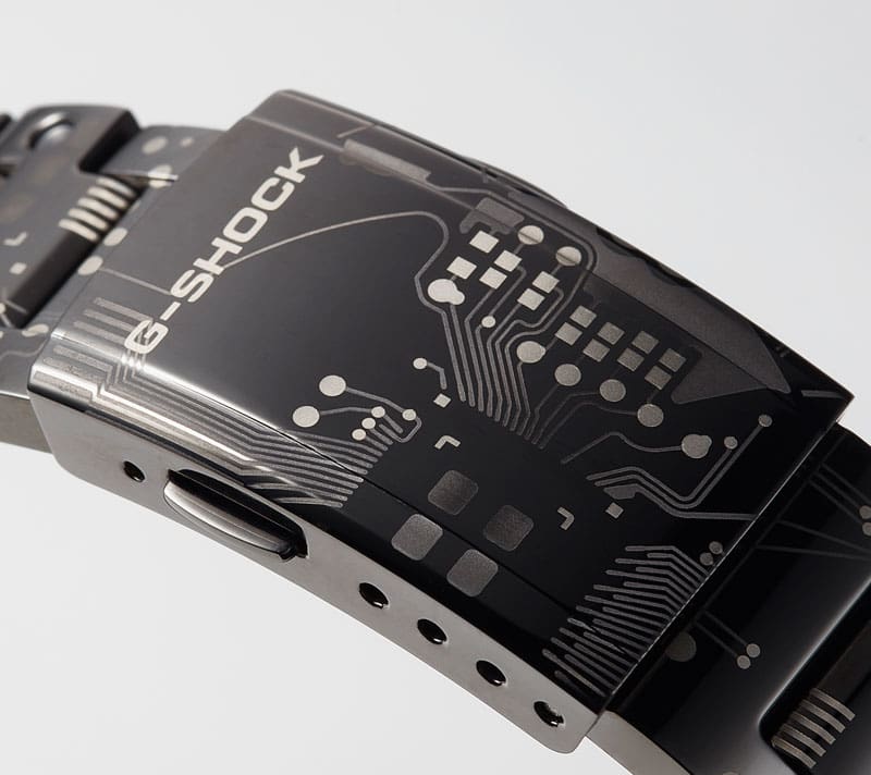 Contrairement à la DWE-5600CC en résine dont le motif camouflage était imprimé, la GMW-B5000TCC utilise comme matériau extérieur un nouveau titane, le TranTixxii™, permettant l'expression de ce motif par gravure laser. Par ailleurs, si le projet au début du développement était d'insérer le motif de carte de circuit imprimé dans une gravure laser unique, la finition plate du prototype a nécessité un passage à deux gravures laser pour une surface plus tridimensionnelle. Après application de la première gravure au laser sur la base argentée, l'ensemble de la surface a été colorée au moyen d'un placage ionique noir. Le second laser a ensuite servi à créer un rendu réaliste dans le motif en lui donnant une impression de profondeur.