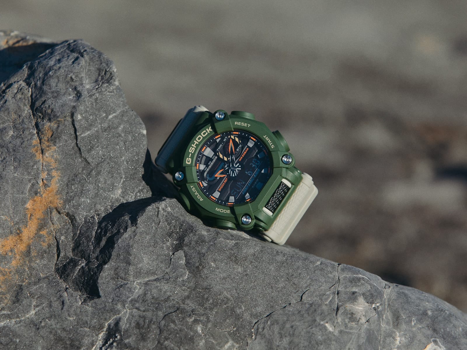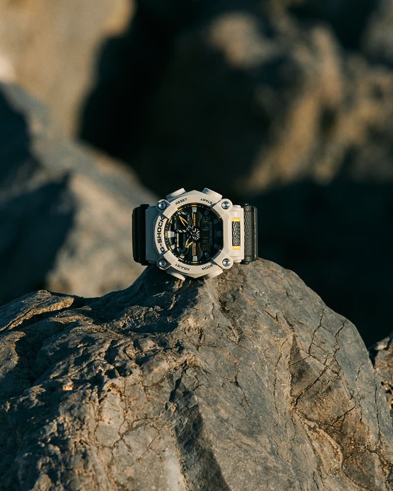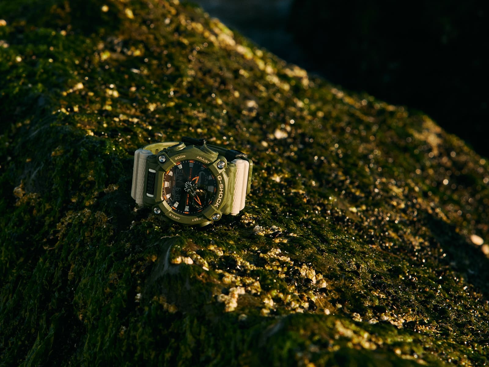 Le modèle phare de la nouvelle GA-900HC-3A a été conçu en pensant à l'exploration d'une région côtière inconnue et à ce à quoi cela pourrait ressembler. Inspirée des montres de la série GA-900, classiques et puissantes, la GA-900HC-3A est entièrement composée d'une lunette en résine verte mate et d'un bracelet en résine brun clair qui crée un design calme et serein. Le modèle GA-900HC-5A est doté d'un bracelet en résine noire et d'une lunette en résine grise mate. Reproduisant l'environnement de la manière la plus authentique possible, chaque pièce adopte la forme d'un modèle analogique-numérique de taille moyenne à la croisée des mondes de la technologie, de la nature et du design.