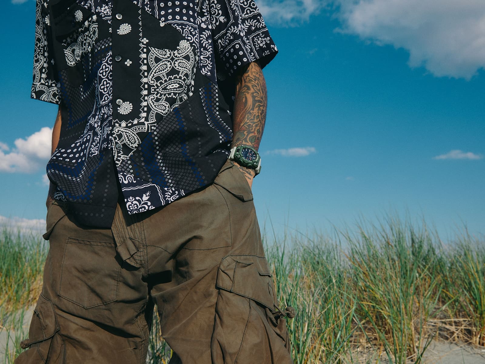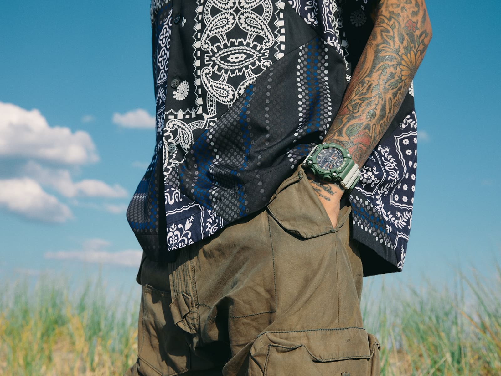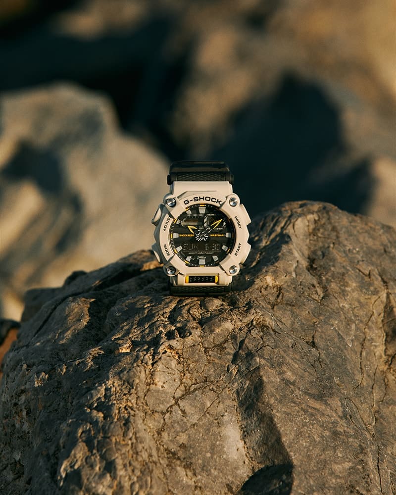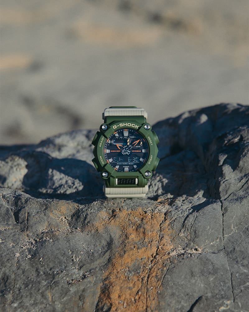 Le modèle phare de la nouvelle GA-900HC-3A a été conçu en pensant à l'exploration d'une région côtière inconnue et à ce à quoi cela pourrait ressembler. Inspirée des montres de la série GA-900, classiques et puissantes, la GA-900HC-3A est entièrement composée d'une lunette en résine verte mate et d'un bracelet en résine brun clair qui crée un design calme et serein. Le modèle GA-900HC-5A est doté d'un bracelet en résine noire et d'une lunette en résine grise mate. Reproduisant l'environnement de la manière la plus authentique possible, chaque pièce adopte la forme d'un modèle analogique-numérique de taille moyenne à la croisée des mondes de la technologie, de la nature et du design.