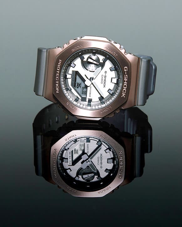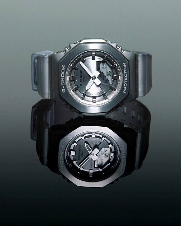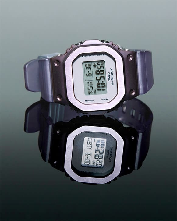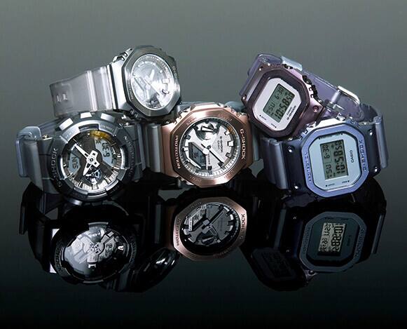Avec ce tout dernier assortiment, la marque a dévoilé de nouvelles versions des modèles GM-2100MF, GM-5600MF et GM-110MF revisitant l'emblématique face avant octogonale avec une finition mate déclinée dans différentes teintes subtiles qui rappellent la nature intangible du brouillard. Le corps neutre à revêtement métallique est doté de bracelets transparents assortis dont émane un doux effet de couleur recouvrant toute la surface.