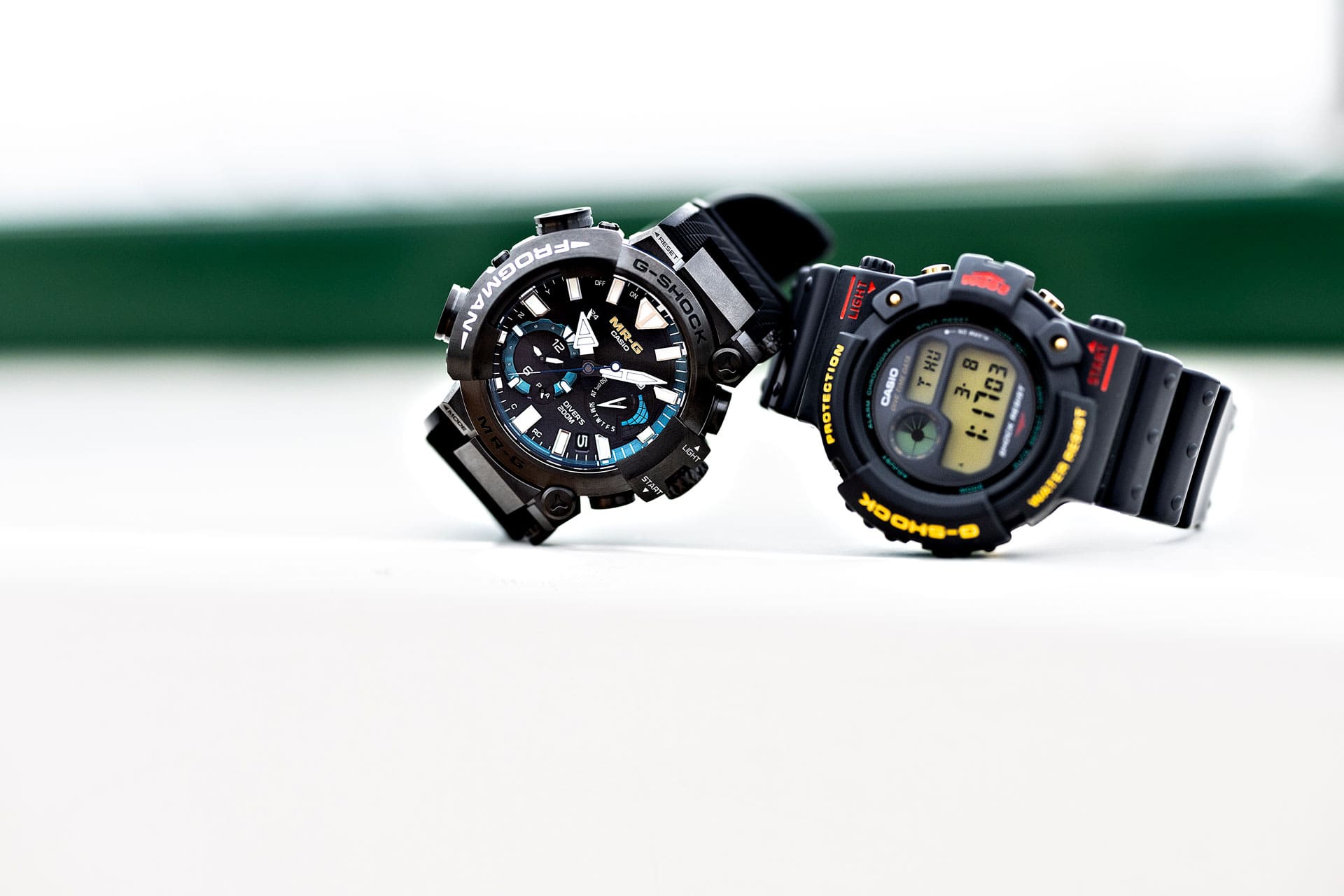 La Frogman, première montre G-SHOCK étanche jusqu'à 200 m conformément à la norme ISO, a été lancée en 1993. La conception asymétrique de cette montre de plongée, dont le nom unique est dérivé des plongeurs eux-mêmes, a par la suite été intégrée à la gamme MASTER OF G, une sélection de modèles résistants aux environnements naturels parfois difficiles, qu'ils soient terrestres, marins ou aériens. Série massivement approuvée, notamment par les professionnels du monde marin, la Frogman voit l'arrivée du tout nouveau modèle MRG-BF1000R arborant un extérieur entièrement en métal. À l'occasion de son 30e anniversaire en 2023, Casio offre à la Frogman une nouvelle apparence parfaitement adaptée à la gamme MR-G, le nec plus ultra des montres G-SHOCK.