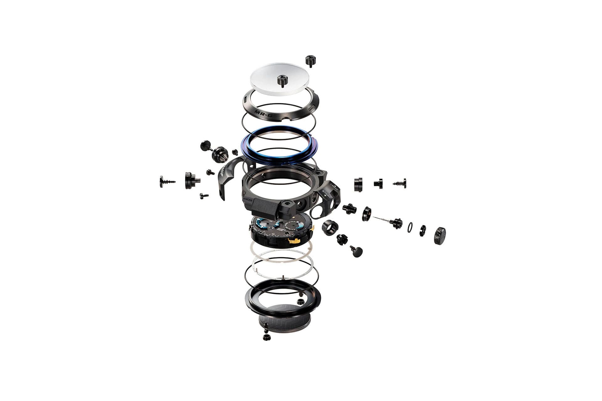 La caractéristique la plus importante de la MRG-BF1000R est la décomposition de ses composants extérieurs, dont le nombre dépasse celui de la MRG-B5000. Les composants du boîtier ont été en effet séparés en 76 pièces, dont le boîtier rembourré, afin de parvenir à une esthétique agréable digne de la série MR-G. Des composants relativement grands tels que la lunette, aux vis et boutons individuels, des mesures appropriées ont été prises afin d'adapter la forme et la taille de chaque pièce. L'extérieur a aussi fait l'objet d'un traitement à double durcissement tant que les composants étaient démontés, le processus de fabrication ayant nécessité dans son ensemble un effort considérable. Les protège-boutons aux positions des 3 heures et des 9 heures ont posé un certain nombre de problèmes. Devant être suffisamment robustes pour protéger le verre et le boîtier, ces composants ne devaient pas être trop épais, au risque de compromettre considérablement la forme et l'esthétique générale de la Frogman. CASIO a consacré beaucoup d'efforts au façonnage d'une forme affinée en trois dimensions tout en insérant un matériau tampon entre la lunette et la montre. Il résulte toutefois de ce développement sans compromis une montre de plongée à la hauteur du nom MR-G et offrant des performances exceptionnelles, le tout dans un aspect luxueux.