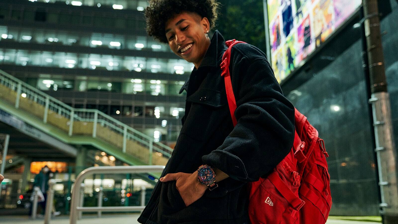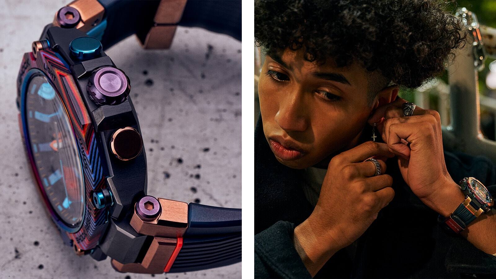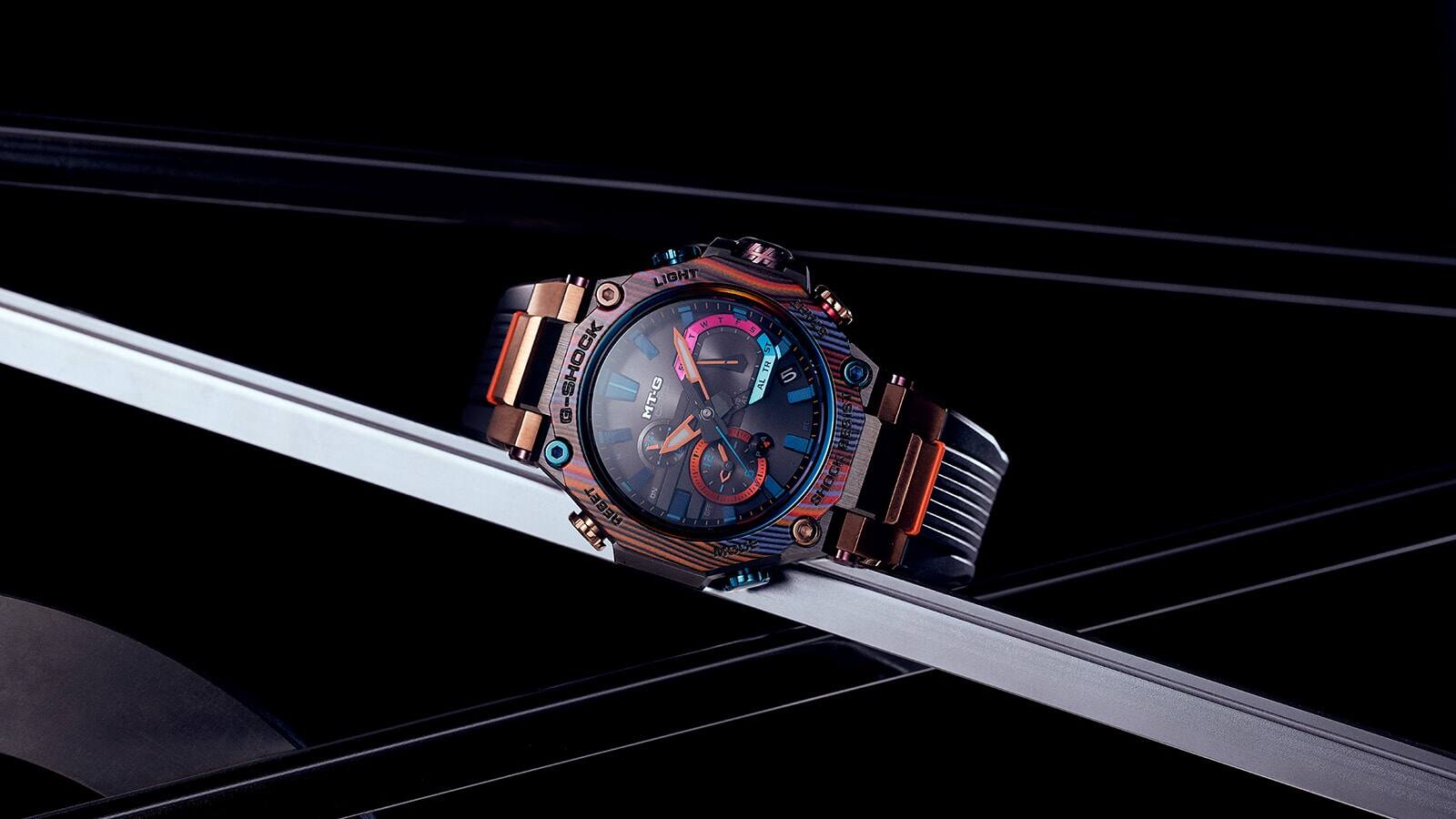 Face à l'esthétique si moderne et avant-gardiste de la MTG-B2000XMG, difficile de croire qu'il s'agit d'un développement de ce design. Auparavant discrètement placée sur le côté de la montre, la section transversale du carbone laminé apparaît désormais audacieusement sur la face avant de la lunette. Par ailleurs, alors qu'elle se composait autrefois de rayures uniformes, elle arbore aujourd'hui un motif ondulé décliné dans une multitude de couleurs. Si CASIO voit dans ce motif l'évocation de montagnes arc-en-ciel naturelles, il ne fait aucun doute que son aspect organique lui confère l'aspect d'un produit de la nature.