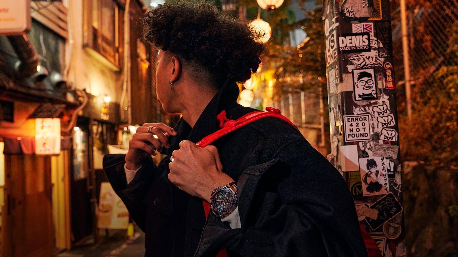 Face à l'esthétique si moderne et avant-gardiste de la MTG-B2000XMG, difficile de croire qu'il s'agit d'un développement de ce design. Auparavant discrètement placée sur le côté de la montre, la section transversale du carbone laminé apparaît désormais audacieusement sur la face avant de la lunette. Par ailleurs, alors qu'elle se composait autrefois de rayures uniformes, elle arbore aujourd'hui un motif ondulé décliné dans une multitude de couleurs. Si CASIO voit dans ce motif l'évocation de montagnes arc-en-ciel naturelles, il ne fait aucun doute que son aspect organique lui confère l'aspect d'un produit de la nature.