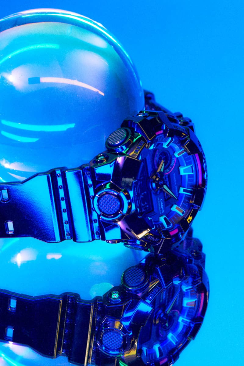 La série « Virtual Rainbow » s'appuie sur la proximité entre la G-SHOCK et la culture du gaming à travers une conception aux accents cyberpunk mettant à profit résine noire brillante et tons irisés pour produire une esthétique futuriste. L'effet prismatique offre au boîtier l'aspect robuste caractéristique de la marque et s'accompagne d'un éclairage hypnotique qui vient embellir la face avant et les aiguilles. Par son adaptation d'une palette de couleurs RVB, la collection se marie à la perfection à vos configurations de jeu tout en s'inspirant dans sa conception des environnements numériques et virtuels modernes.