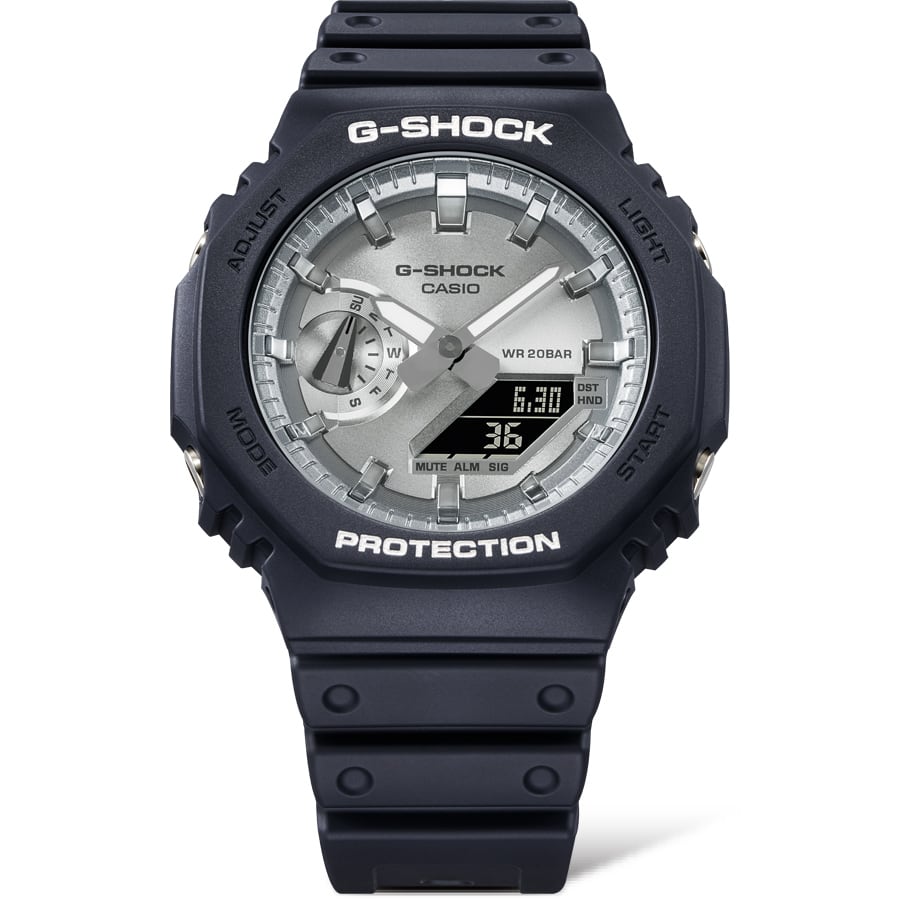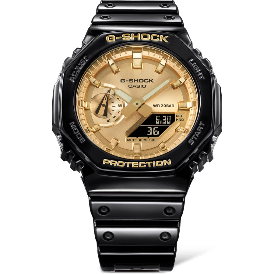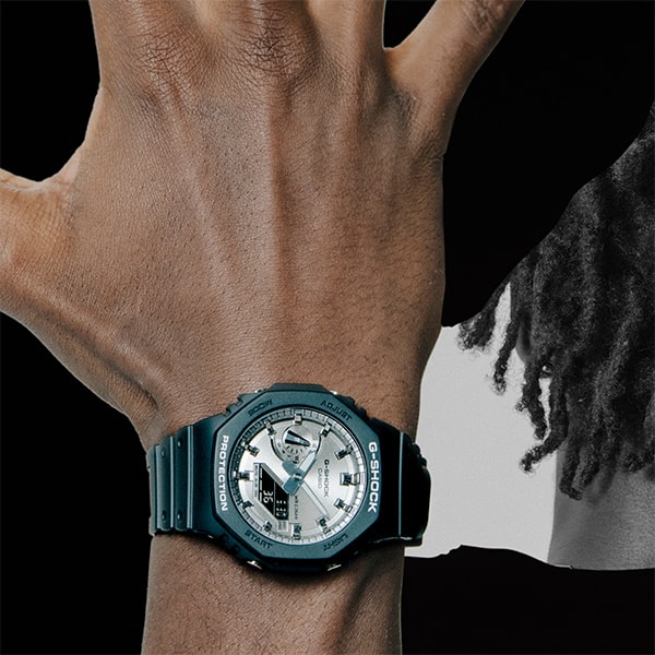 Les montres G-SHOCK série 2100 voient aujourd'hui l'arrivée de deux nouveaux modèles arborant des coloris noir et métallique populaires s'inscrivant dans la continuité de notre quête d'une résistance ultime. Héritant de l'emblématique forme octogonale de la DW-5000C, tout premier modèle de la gamme G-SHOCK, la GA-2100 est une montre numérique-analogique qui conserve la même construction robuste, mais avec un profil encore plus fin culminant à 11,8 mm seulement. La lunette et le bracelet de la montre couleur or sont revêtus d'une finition brillante, tandis que la montre couleur argent arbore une finition mate, offrant le choix entre deux modèles aux personnalités distinctes.