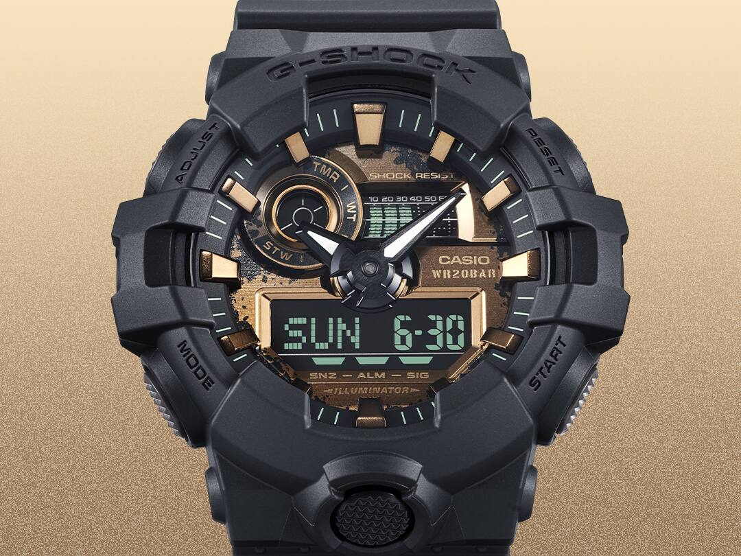 Le noir classique typique de la G-SHOCK rencontre des couleurs inspirées de l'aspect texturé du métal vieilli. L'ensemble du design de cette montre renvoie une image de robustesse et de résistance aux environnements les plus exigeants, associée à un style vintage intemporel.
