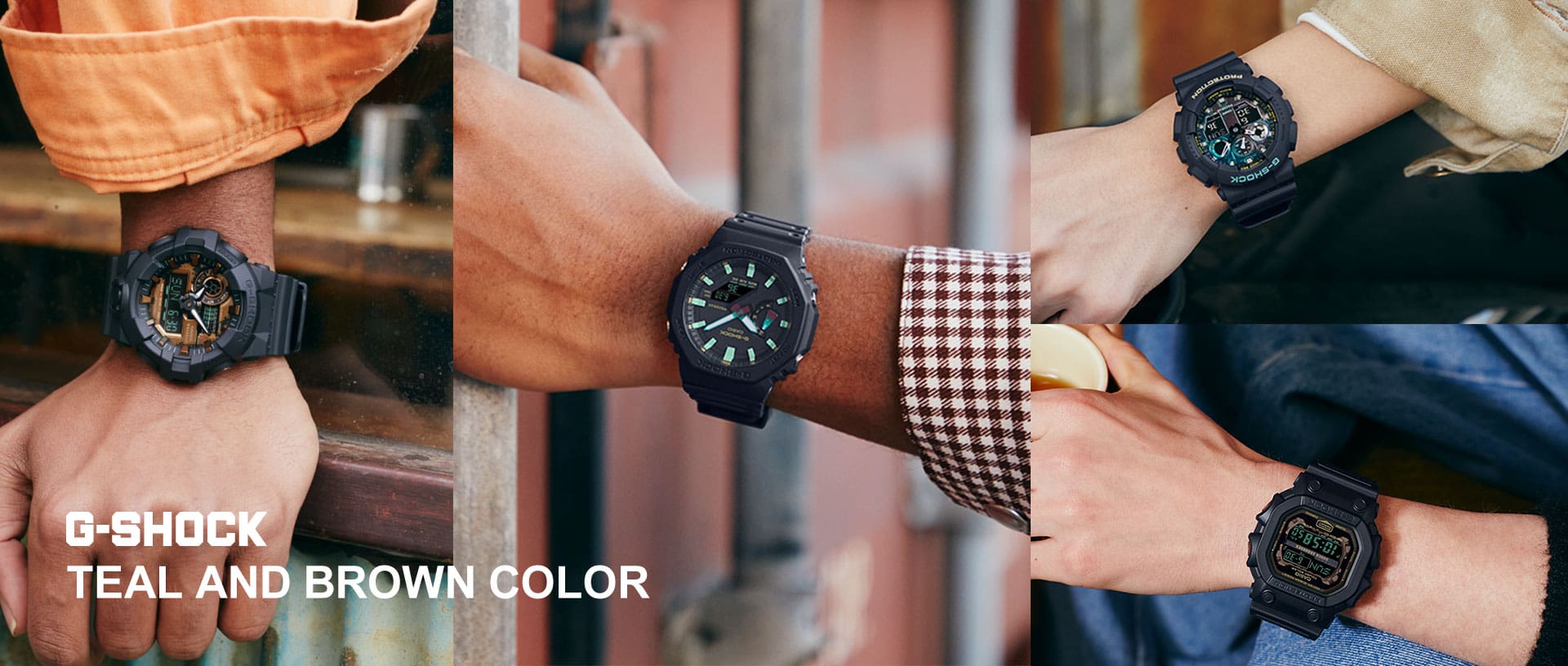 Une palette de couleurs saisissante dans des tons bleu sarcelle (AWG-M100RC) et marron (GX-56RC) vient souligner le cadran.
