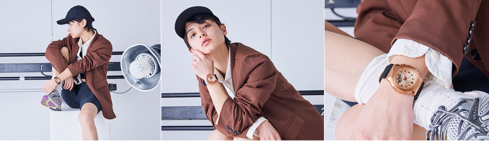 Les variations de couleur sont proposées avec placage ionique en or rose (GM-S2100PG) et gris foncé (GM-S2100B) appliqué aux composants métalliques. Ce style monochrome confère au cadran un aspect cohérent et minimaliste.