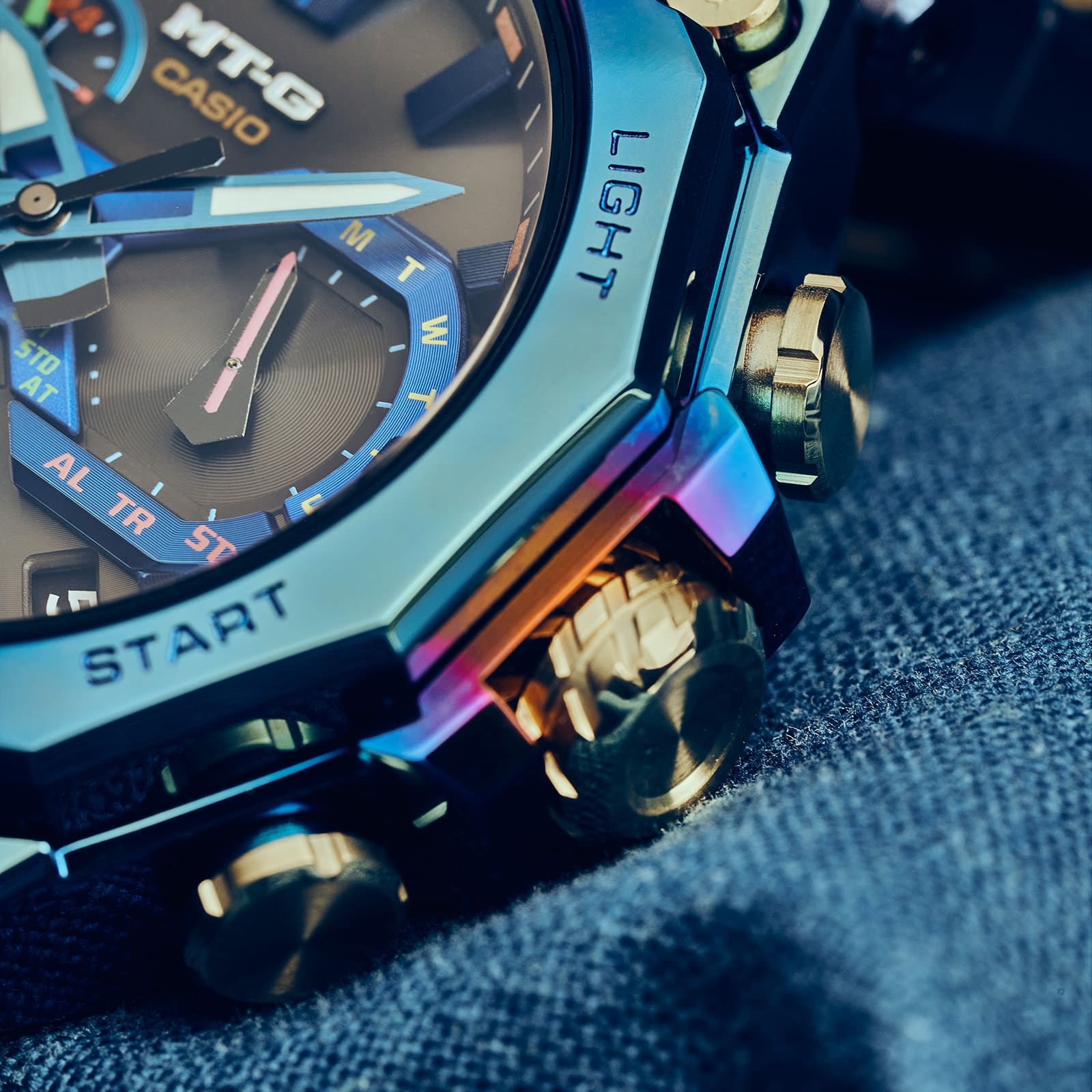 Rainbow IP was first adopted by G-SHOCK over ten years ago and after a decade of extensive testing and development, IP is an indispensable element of G-SHOCK’s approach to color, material, and finish (CMF). Rainbow IP is a highly difficult method to achieve and the unique finish involves a challenging process of depositing a color film on individual watch parts through the adhesion of metal particles via a complex gas reaction. The multi-hued IP tone has a deep blue base to its coloration, but the vapor deposition and coating methods used produce a unique, one-of-kind miasma of color for each watch, right from the get-go.
