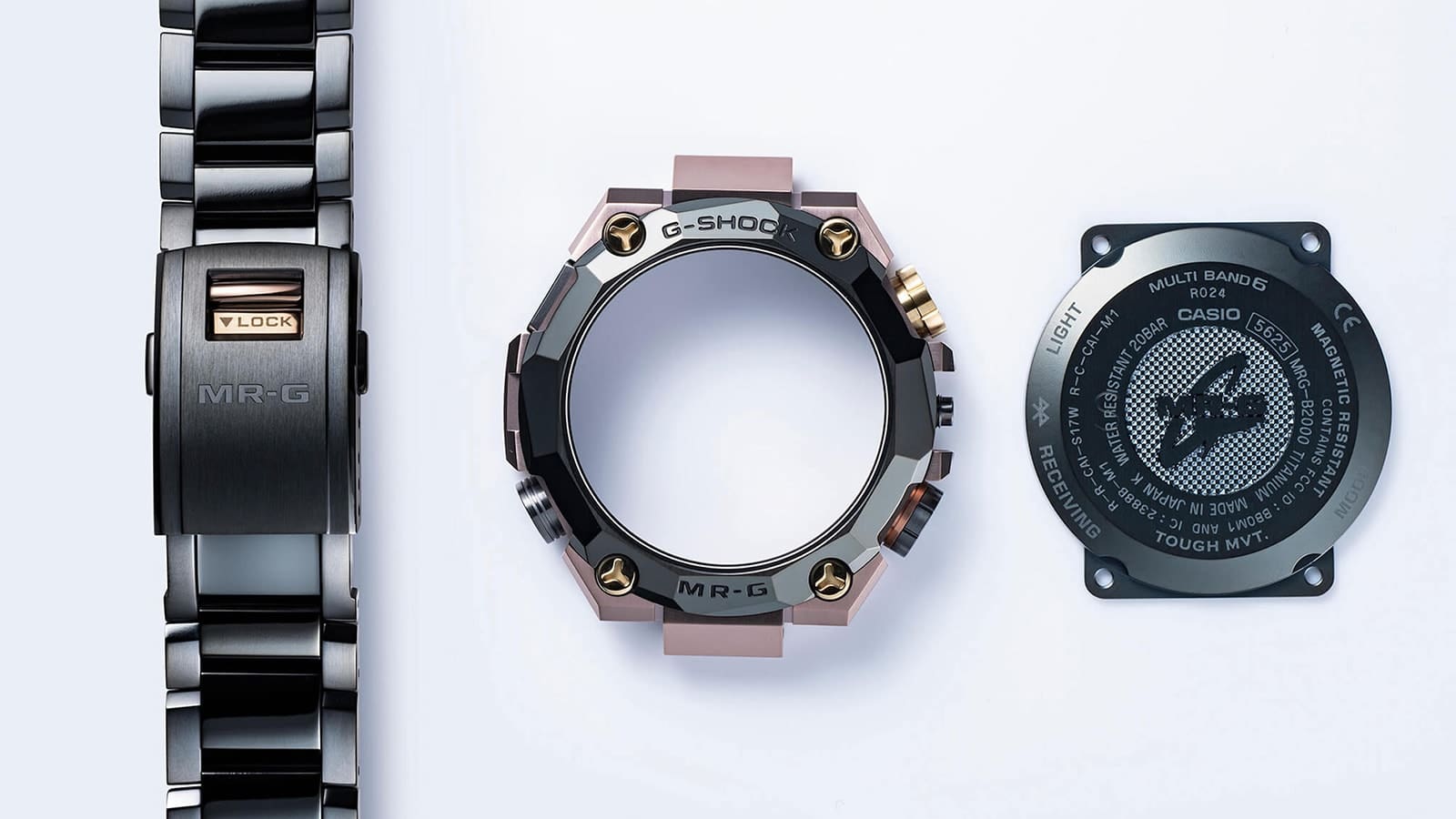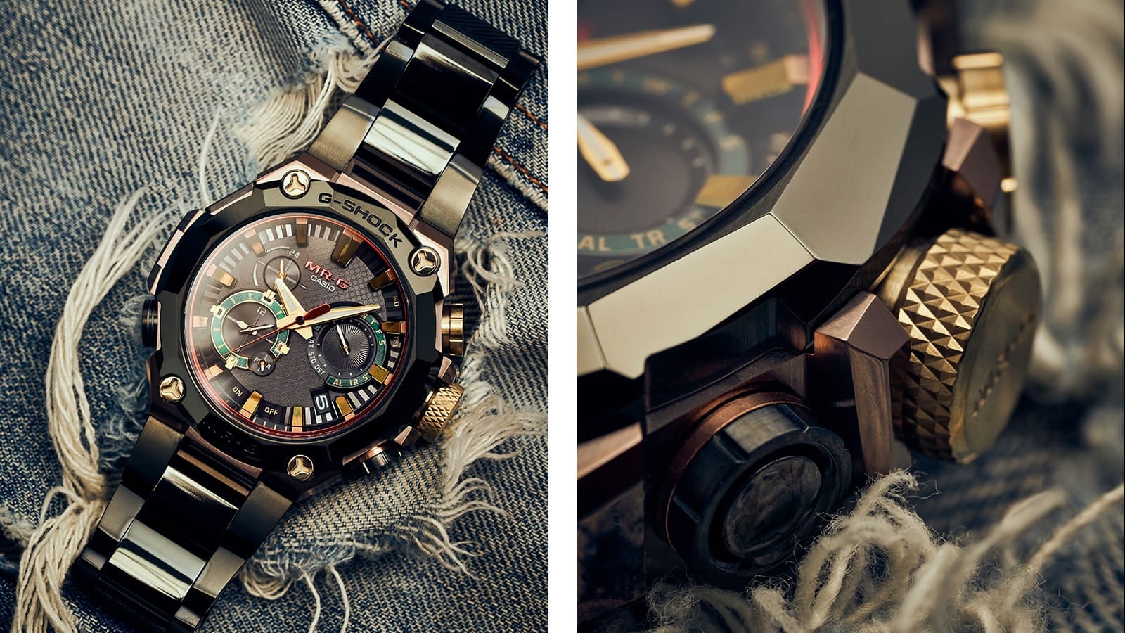 An exquisitely angular facet-cut bezel produces an eye-catching glossy luster, while the dominant grey-green metallic tone of the timepiece nods to a traditional kurogane-iro (literally “iron color”) and is vibrantly produced on the bezel and band with a new dark green DLC finishing technique and mirror-polishing. Throughout the production process of the MR-G line, G-SHOCK adopted Japanese traditions such as Tsuiki, or hand-hammered copperware and the use of koki-beni, or crimson, which is a traditional Japanese color. A mere handful of watches were produced each day, further elevating the high-art finishing of these cases. The bezels, which are the most distinctive feature, are inherently unique and owe their one-of-a-kind finish to the hand craftsmanship behind the Hana Basara.