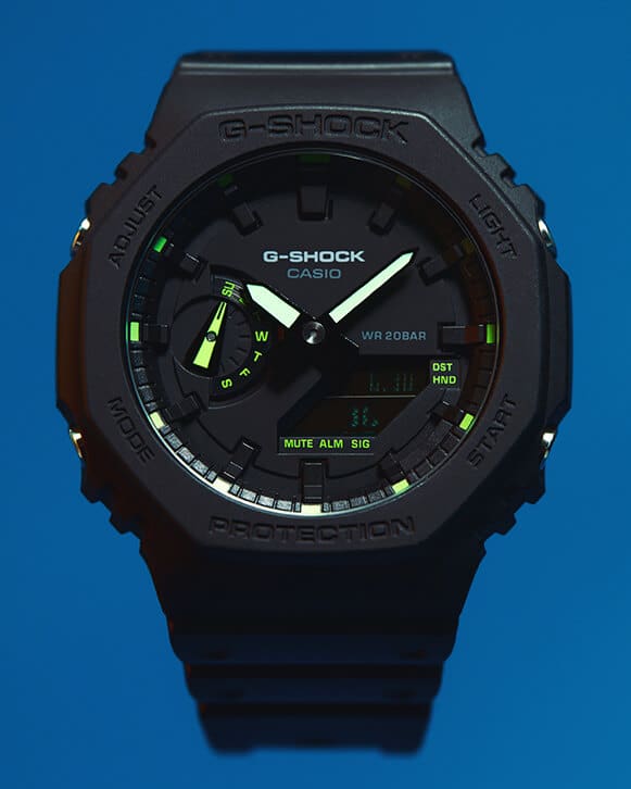 The featherweight and slim GA-2100 model features a Carbon Core Guard structure and an interior case made of carbon fiber-reinforced resin, boasting G-SHOCK’s familiar ruggedness with futuristic design. The strengthened internal mechanisms contribute to GA-2100’s shock-resistant body, including its 200-meter water resistance. For added measure, G-SHOCK reinforces its internal components in urethane, adding suspended timekeeping modules inside the watch structure for premium stabilization. Despite the model’s durable armor, the timepiece feels lightweight on the body.