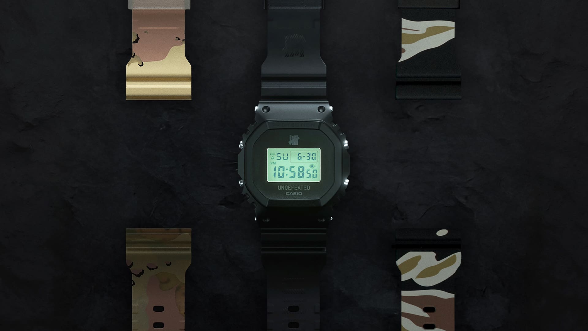 DWE-5600 搭載醒目的綠色 LCD,配上黑色底色和半透明黑色錶帶。UNDEFEATED 標誌性的五道橫紋圖案,同時呈現在錶背和點亮時的 LCD 上。這個標誌也巧妙融入短錶帶,品牌標誌則印於長錶帶上。