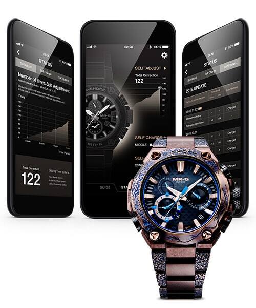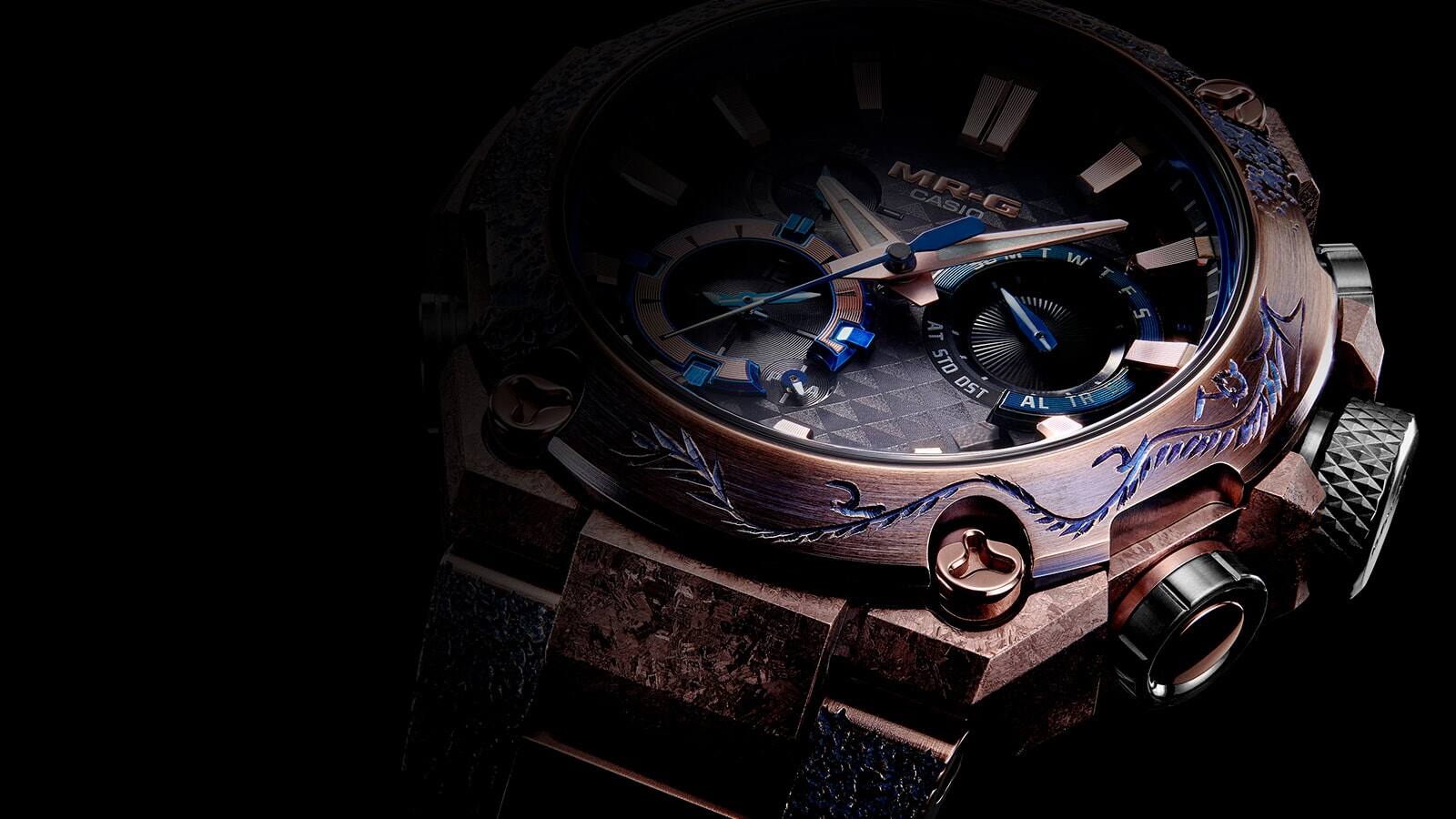 MRG-B2000SH 從專為 MR-G 系列製作的傳統日本武士頭盔中汲取靈感,展現武士將領的尊貴精神與美學。每個錶圈代表頭盔前立(徽飾),並均由技藝精湛的浮雕師逐一雕出威猛龍紋。錶殼與錶帶由特製的金屬模具鑄造,營造鐵鏽的粗糙感,表面則以棕色和藍色的復古風格離子電鍍處理,呈現折舊的造型。Casio 與傳統藝術的專家攜手合作,讓引以為傲的日本精湛工藝與先進技術完美結合。