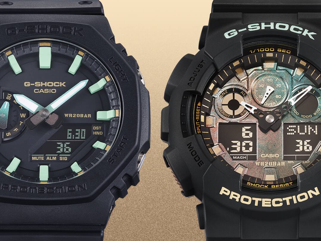 Tampilan dan nuansa logam yang berubah seiring berlalunya waktu diwujudkan dengan pencetakan gradasi pada jarum jam (GA-2100RC) dan dial (GA-100RC).