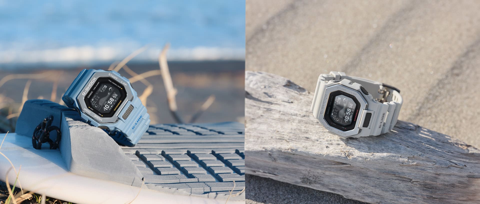 Memperkenalkan arloji pilihan para peselancar terbaik di seluruh dunia - model baru berwarna pantai alami dari lini sport G-SHOCK G-LIDE, berdasarkan model dasar GBX-100, yang memberikan akses mudah ke informasi pasang surut yang penting bagi para peselancar, serta waktu matahari terbit dan terbenam di kurang lebih 3.300 lokasi di seluruh dunia.