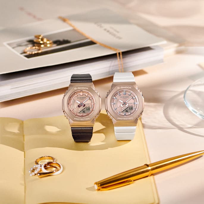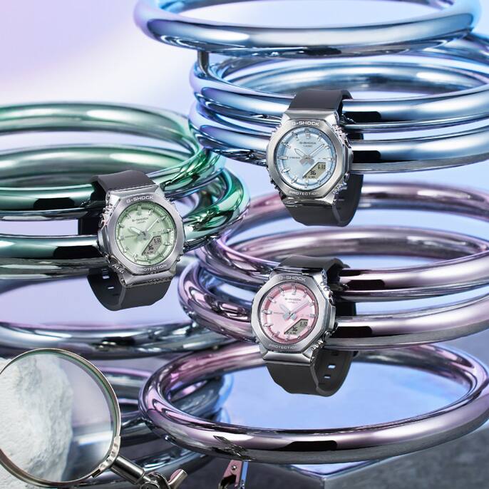 Memperkenalkan dua jam tangan GM-S2110 baru dengan bezel dan dial logam. Dial yang sedang tren dengan warna cemerlang meningkatkan tampilan murni dari bentuk segi delapan yang ikonik. Tali jam berwarna putih selaras dengan kilau logam, menghadirkan sentuhan mewah pada pergelangan tangan Kecemerlangan dan keindahan - logam yang berkilau dengan individualitas baru.