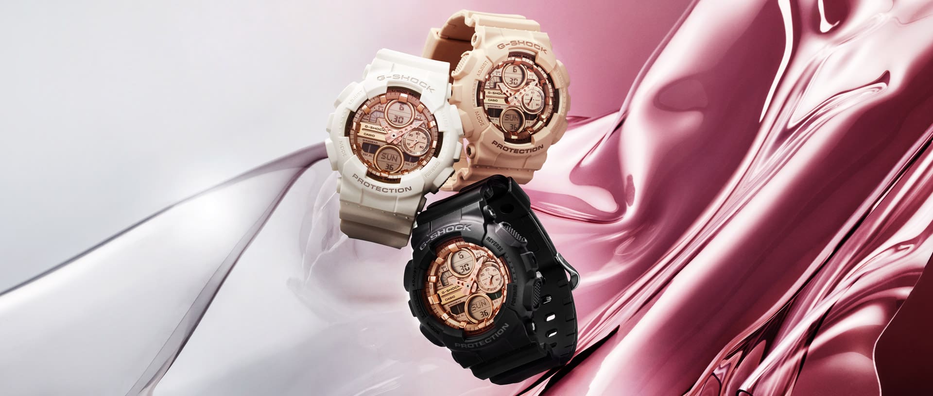 Tersedia dalam warna hitam, pink, dan putih, setiap varian warna menonjolkan aksen pink-gold yang berkilau, memberikan sentuhan fashion yang subtle pada pergelangan tangan. Paduan warna pada dial berpadu indah dengan aksesori metal berwarna serupa, memungkinkan pengguna mengekspresikan gaya khas mereka sendiri. Komponen resin utama pada bezel dan band dibuat dari resin berbasis bio, material yang berasal dari sumber organik terbarukan, dan diharapkan dapat membantu mengurangi dampak terhadap lingkungan.