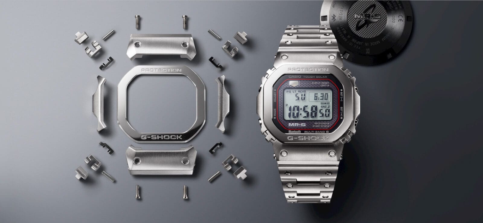 Finishing karbida titanium pada MRG-B5000D menghadirkan kilauan metalik yang menawan. Lapisan karbon serupa berlian (DLC) pada casing dan tali jam MRG-B5000B mengembalikan nuansa hitam ikonis dari model G-SHOCK pertama, tapi kali ini berbahan logam. Komponen seperti tombol dan penutup belakang memiliki finishing IP berwarna emas.
