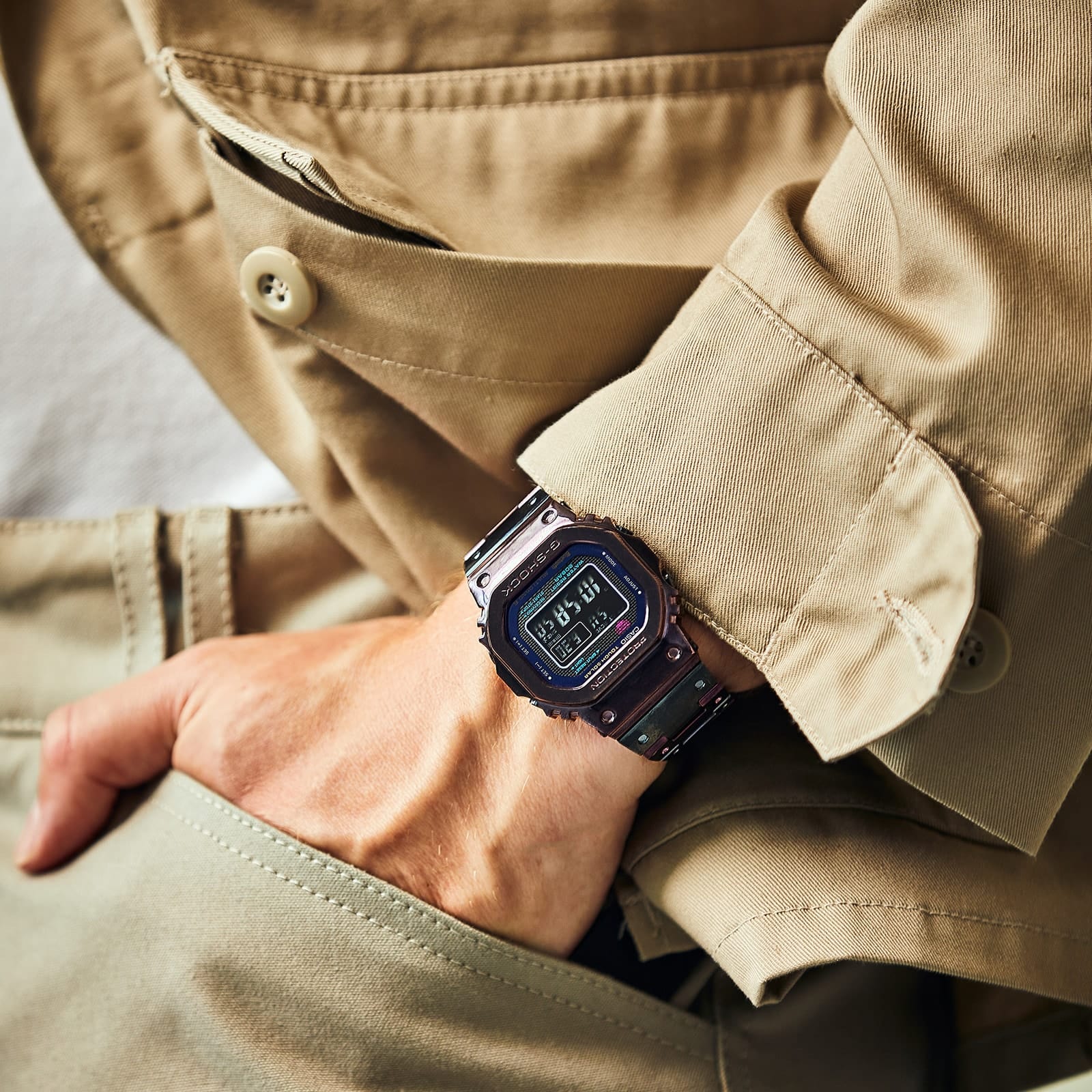IP is a processing method for coloring by ionizing metal in a vacuum and depositing a thin film on the surface of the object, and is one of the key technologies used to create the colors used in the CMF (Color Material Finish) designs that Casio has been promoting in recent years. This is particularly evident in the GMW-B5000 series, which is based on the G-SHOCK ORIGIN and has a full-metal exterior. While the B5000D, which uses stainless steel for the case and band, is the starting point, the series has since been expanded to include black, red, blue, and other IP finishes. To top it all off, in April 2021, Casio released the GMW-B5000TR, with each piece of the band having a different color IP.