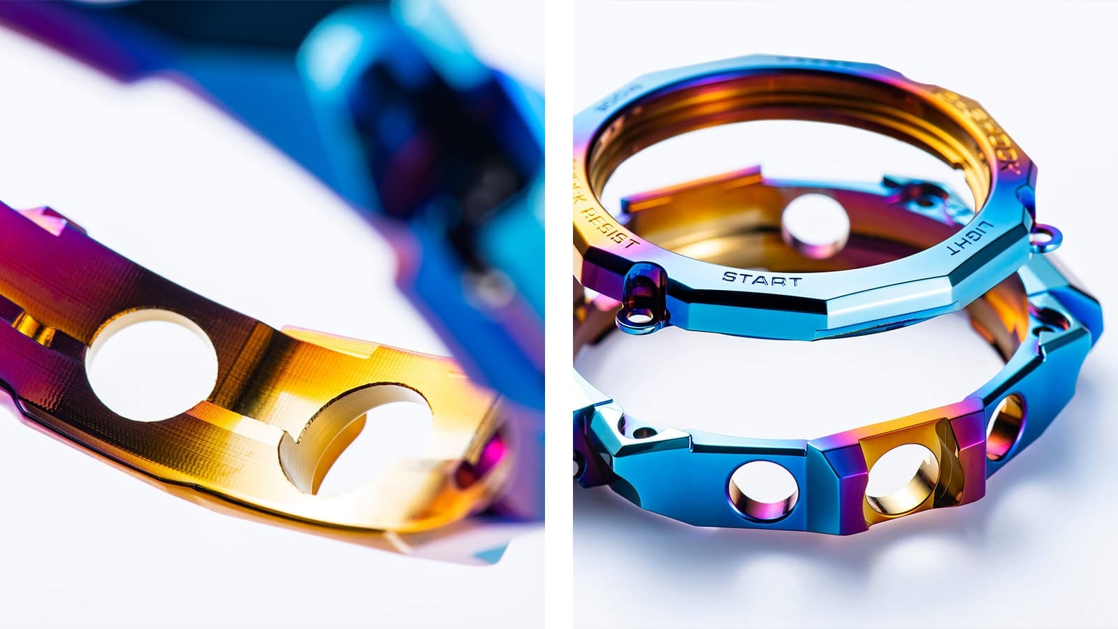 Rainbow IP was first adopted by G-SHOCK over ten years ago and after a decade of extensive testing and development, IP is an indispensable element of G-SHOCK’s approach to color, material, and finish (CMF). Rainbow IP is a highly difficult method to achieve and the unique finish involves a challenging process of depositing a color film on individual watch parts through the adhesion of metal particles via a complex gas reaction. The multi-hued IP tone has a deep blue base to its coloration, but the vapor deposition and coating methods used produce a unique, one-of-kind miasma of color for each watch, right from the get-go.