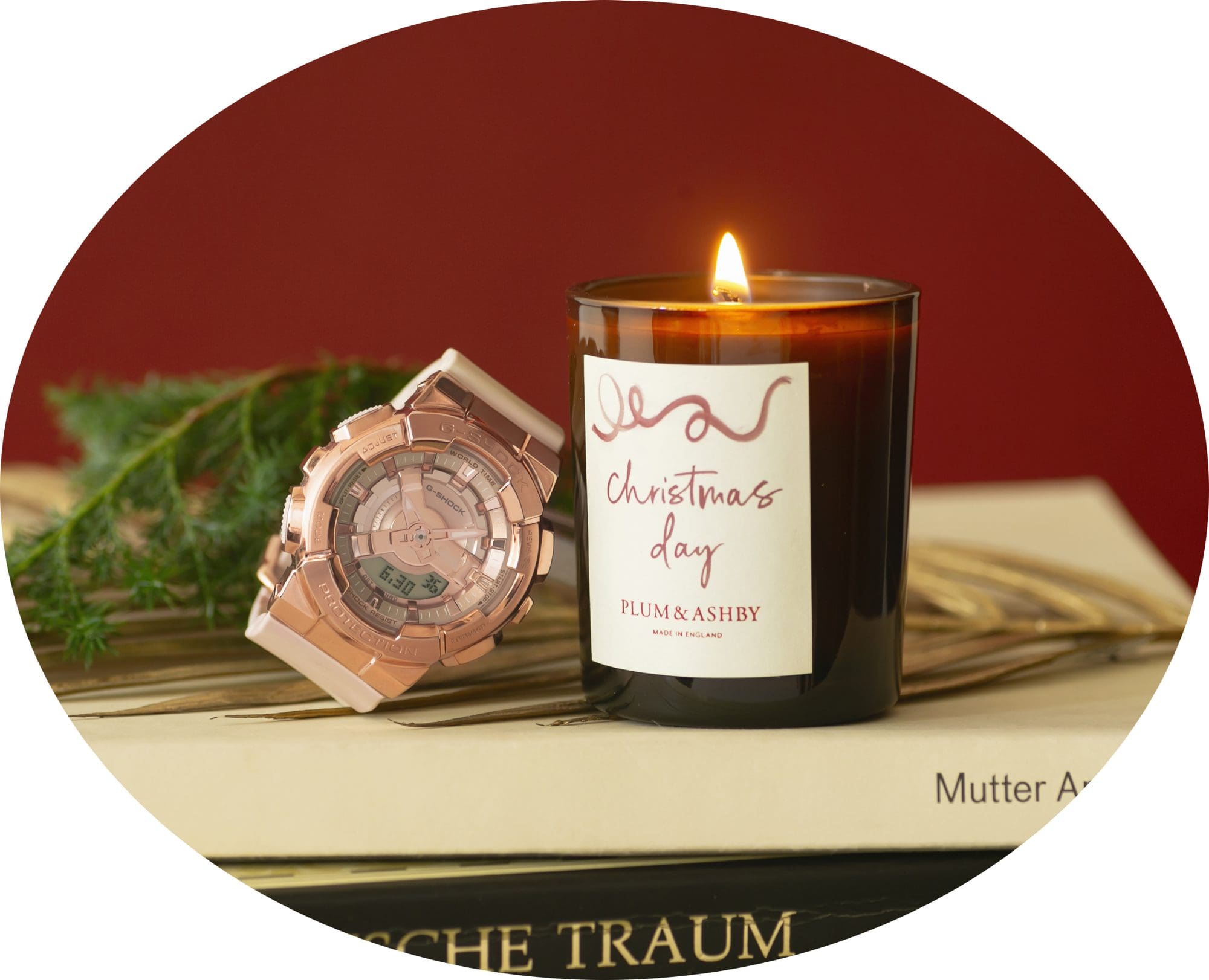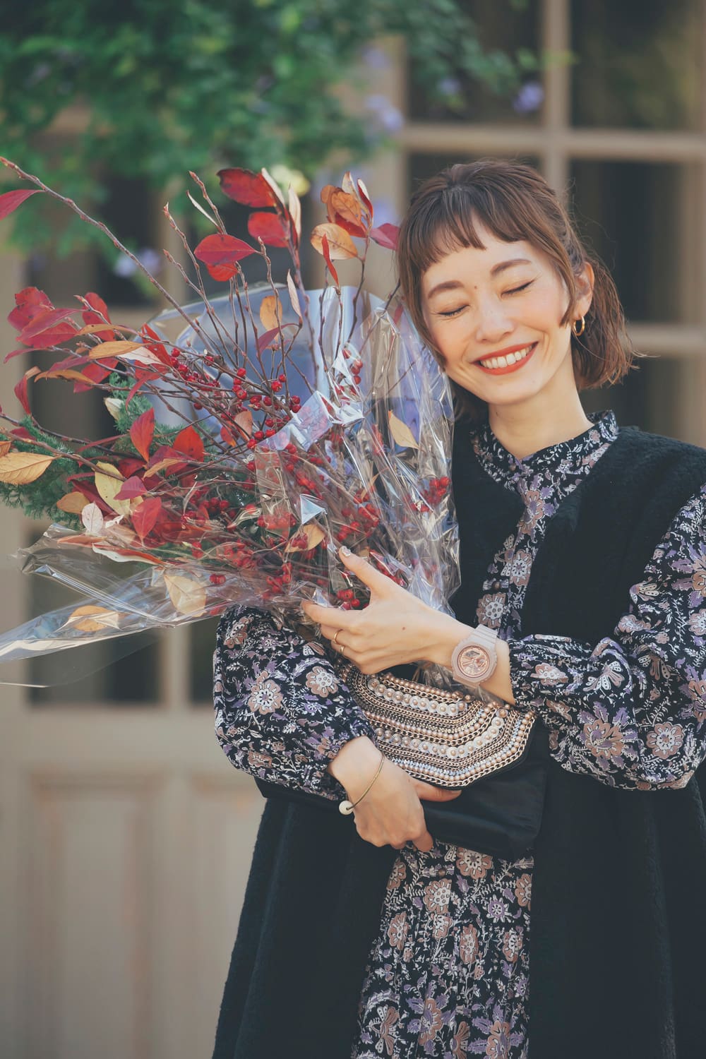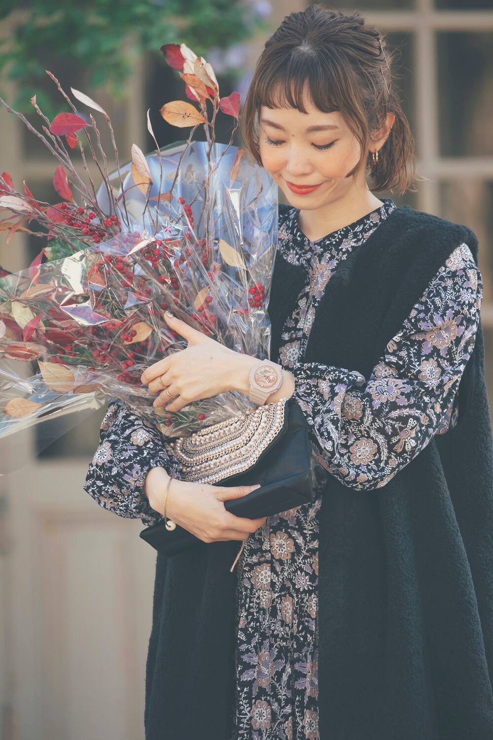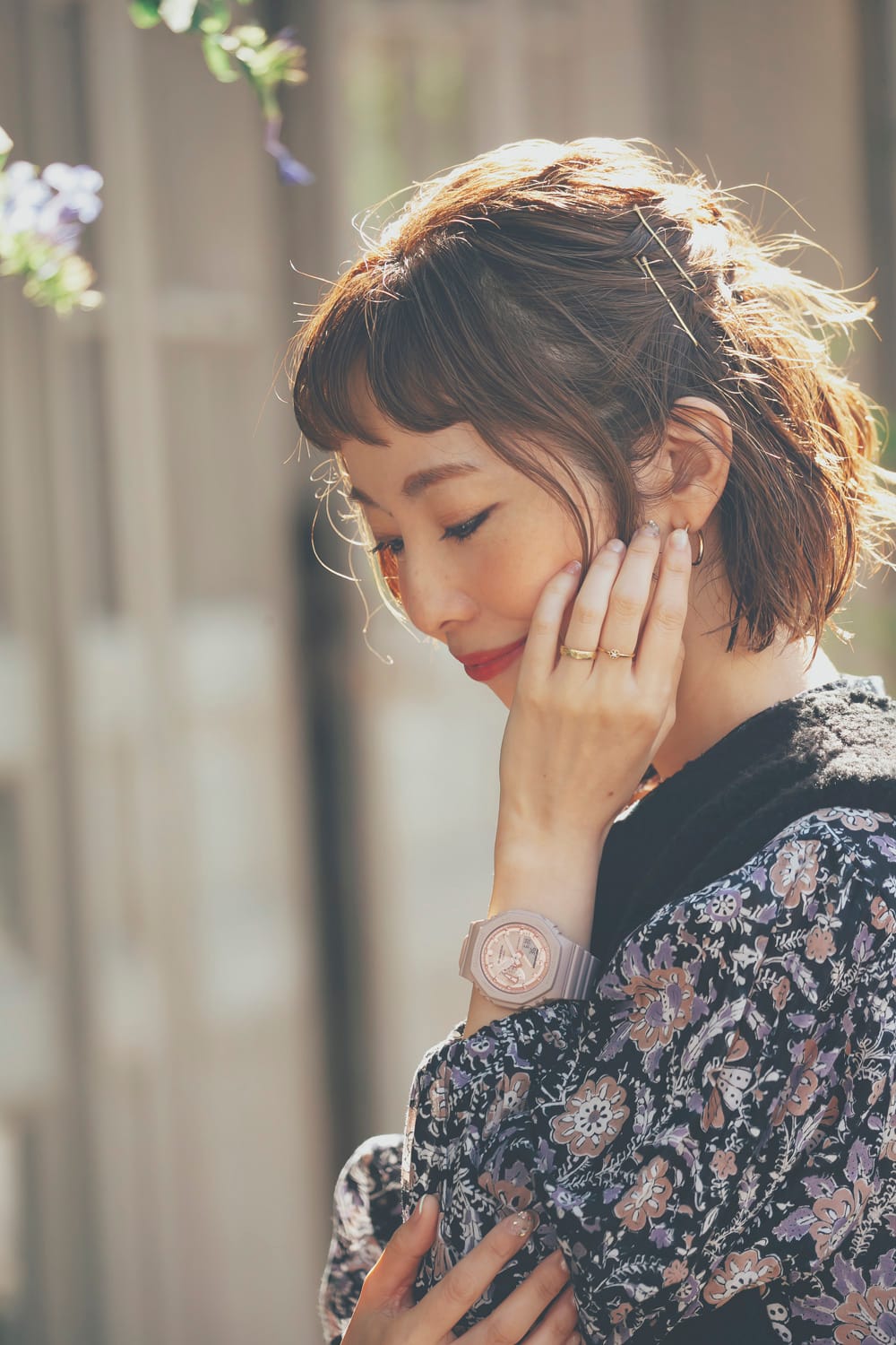 これからクリスマスのホームパーティーということで、緻密なフラワーパターンが全面にあしらわれたヴィンテージドレスに、上品なメルトンのベストをレイヤードした、大人シックな着こなしを披露してくれたむらたさきさん。ドレスの生地のプリント柄の色をひろって合わせた、ピンクベージュの《G-SHOCK》がさりげないアクセントを添え、バックスタイルまで抜かりなく可愛いセルフヘアアレンジが、この日の装いをより特別感のあるものへとアップデートしてくれています。