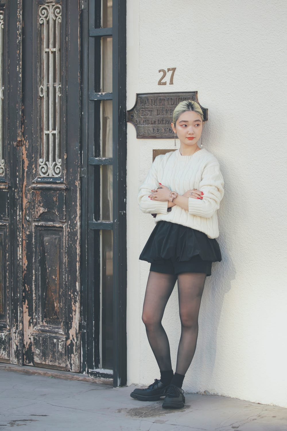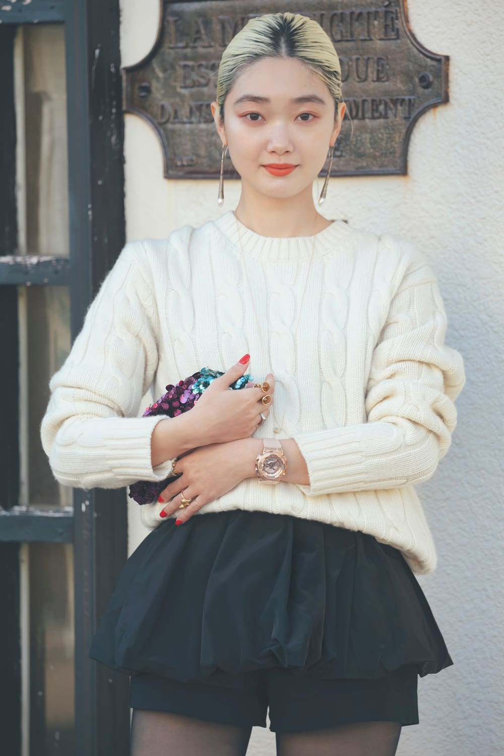 モードなアイテムもカジュアルなアイテムも自由自在にMIXしながら、今の気分を感じさせるセンスのいい装いに定評のあるMio Yanaseさんは、インフルエンサーとして活躍の場を広げつつ、人気セレクトショップのスタッフとしても働く、今をときめく東京のイットガールの一人。この日は、コージーなケーブルニットセーターを主役にしつつ、ペプラムベルトの投入やスパンコールのクラッチバッグを合わせることでホリデーシーズンらしい華やかさも感じさせるカジュアルなスタイリングで登場。その手元に輝くのはピンクゴールドの《G-SHOCK》。
