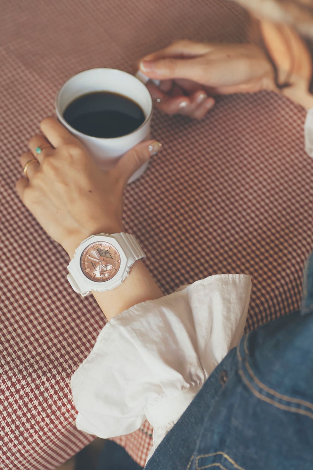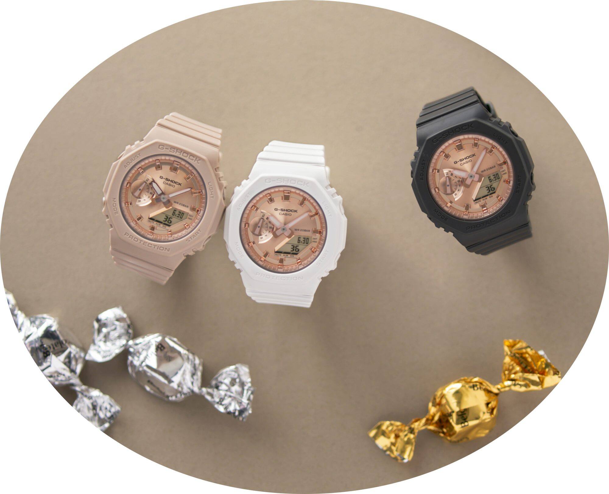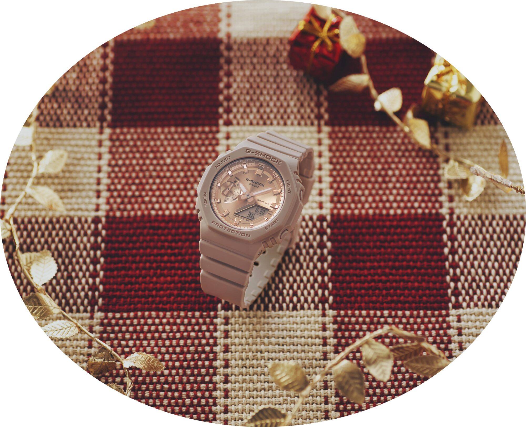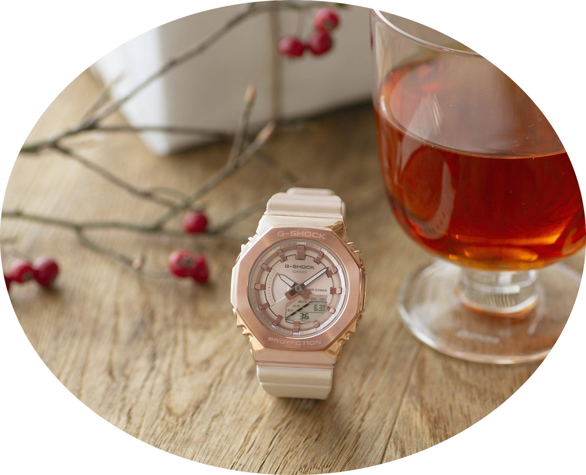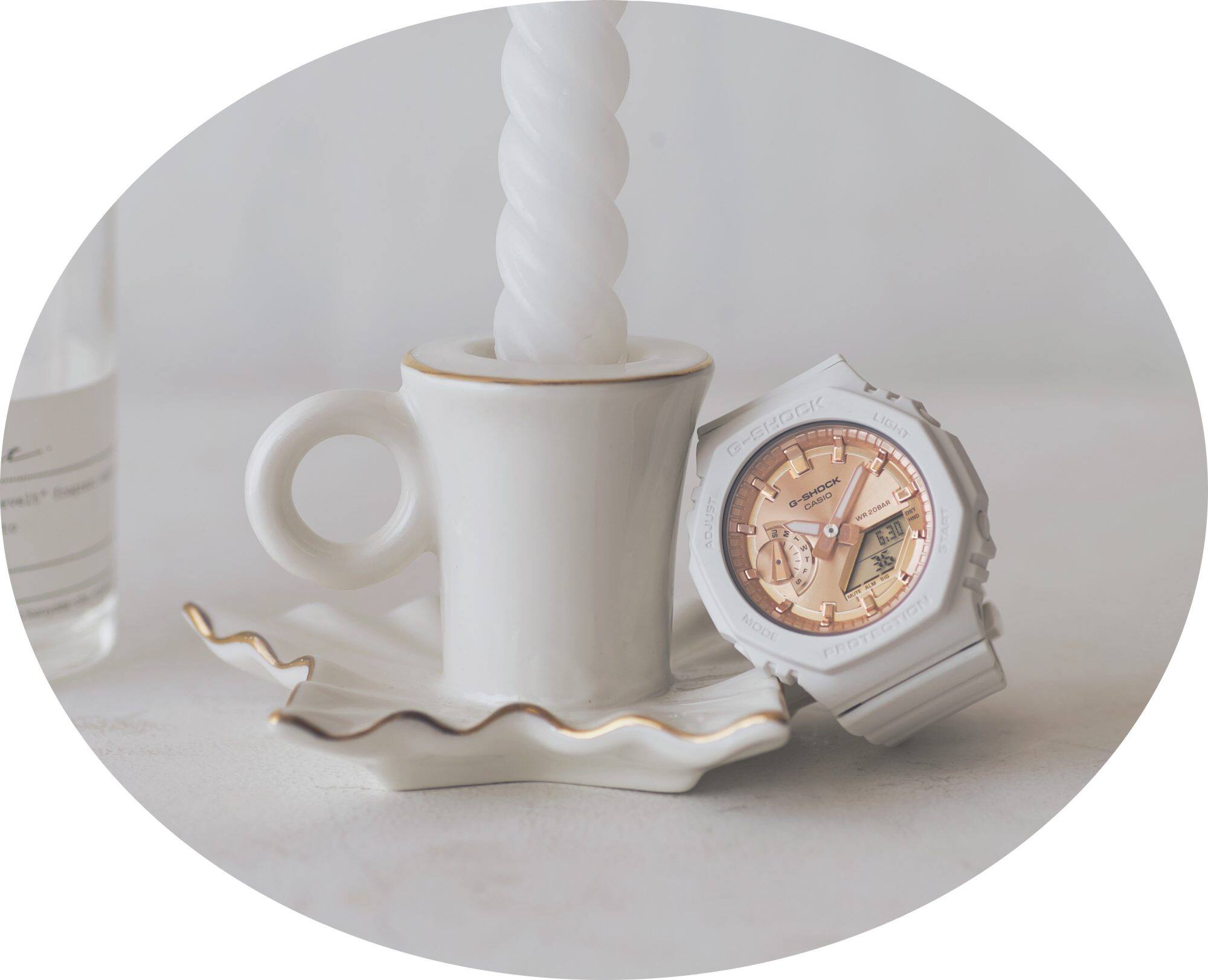 人気のデジタル・アナログコンビモデル「GMA-S2100」シリーズは、きらっと輝くピンクゴールドの蒸着文字板に、ソフトマットな質感のケース&バンドを合わせた、しなやかなコントラストが魅力のウォッチ。中でも、ホリデーシーズンの雪を思わせるようなホワイトカラーの「GMA-S2100MD-7AJF」は、冬の装いにイノセントでクリーンなムードを添えてくれるモデルです。