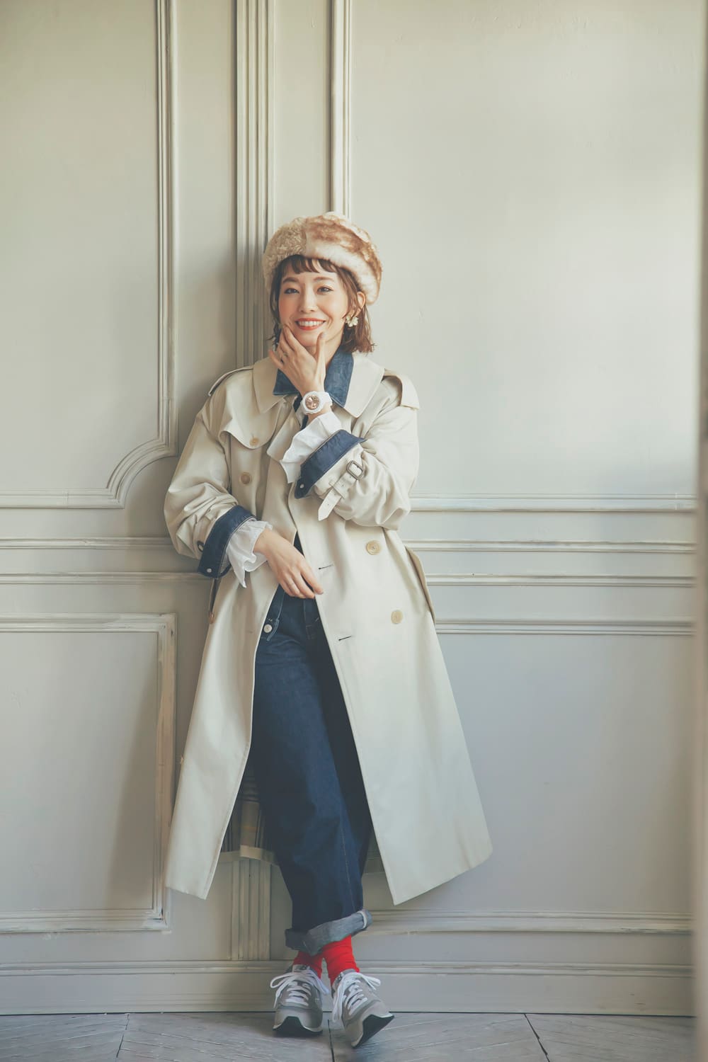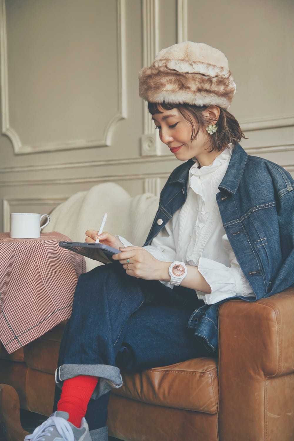 イラストレーターでモデルのむらたさきさんは、作風やルックスの可愛らしさはいわずもがな、ハッピーでポジティブな人柄も含めて憧れる人が多いイットガール。そして、3人のお子さんのママでもあるというから驚く。むらたさんは、ガーリーでカジュアルな着こなしが上手で、この日は、THEカジュアルとも言えるデニムジャケット×デニムパンツのスタイリングに、彼女らしいチャーミングなムードをプラスしてスタイリング。白いコットンブラウスの袖口の先にきらりと輝くのは《G-SHOCK》のメタルの文字盤。