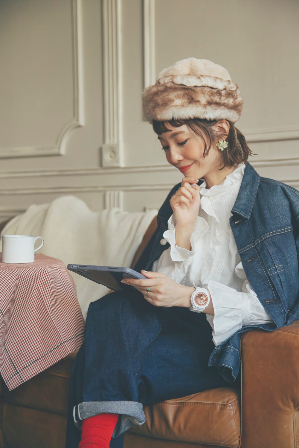 「クリスマス前のうきうきした気分の今、デニムのセットアップスタイルに甘めのフリルブラウスを合わせて、デイリーながらも気分の上がるコーディネートがテーマです。《G-SHOCK》は、存在感があるフォルムなので、一点投入でも十分に着こなしのポイントになって、全体のオシャレ感がアップする気がします。今回着けているホワイトのケース&バンドの『GMA-S2100MD-7AJF』は、大人カジュアルに好相性! ボーイッシュ系もガーリー系もハマる、万能ウォッチです」(むらたさきさん)
