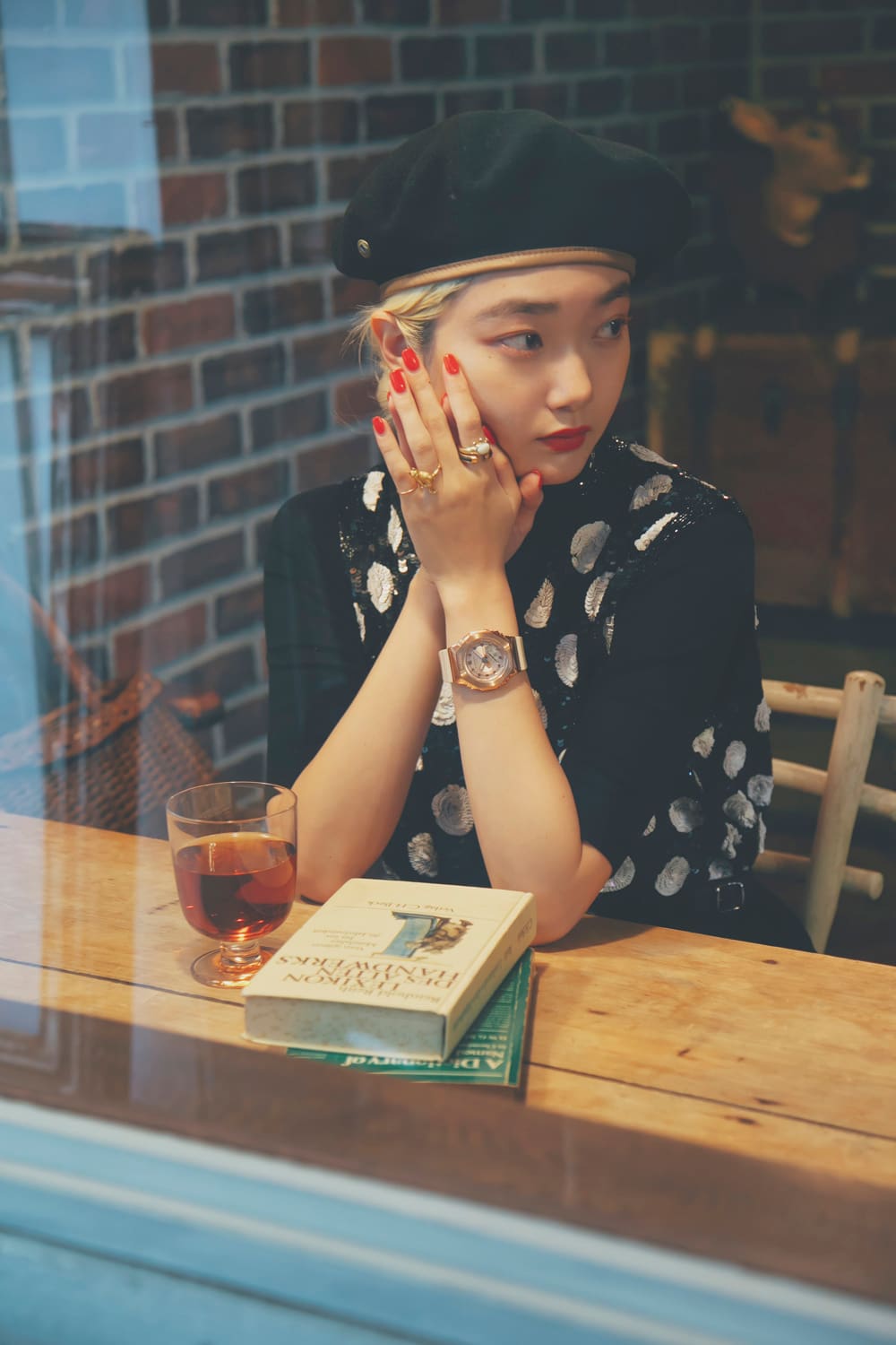 「フェミニンなドレスアップスタイルにも馴染むようなオシャレさと、使い勝手のよい機能面を兼ね備える時計は、なかなかないのでは? この『GMA-S2100MD-4AJF』は、ひとつ前のルックで着けている《G-SHOCK》の同型色違いで、2色ともそれぞれ活躍してくれること間違いなし、色違いでそろえても良さそう。かつて、学生時代にスポーティーなデザインの《G-SHOCK》を愛用していました。今は、この「GMA-S2100」シリーズが気になる。程よくカジュアルな気の利いたデザインで、可愛いものが好きな大人女子にぴったりだと思います」(むらたさきさん)