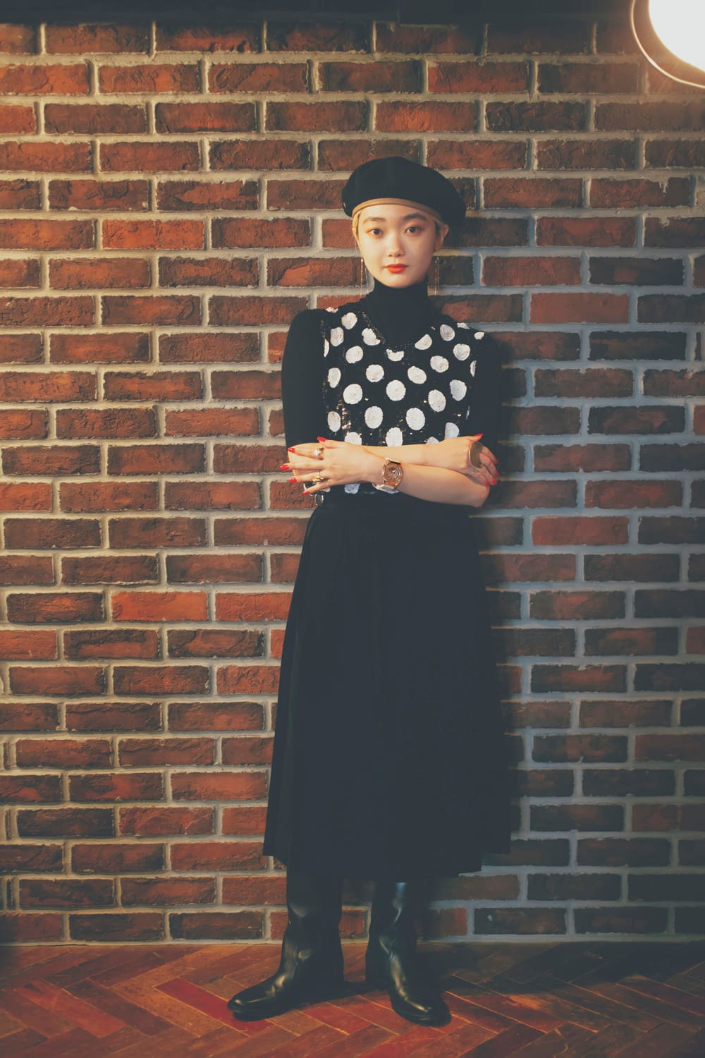 クリスマスムードが一層盛り上がり始める夕刻の街によく似合う、ラグジュアリーな総スパンコールのドット柄のトップスに、ベロア素材のオニールオブダブリンを合わせたエレガントな装いも様になるMio Yanaseさん。リップとネイルに纏わせた赤色、アクセサリーに配された白いパールなど、着こなしのアクセントになるクリスマスカラーも上手に取り入れつつ、《G-SHOCK》でコーディネートを締めるテクニックは、ぜひともこのホリデーシーズンのスタイリングアイデアとして見習いたいもの。