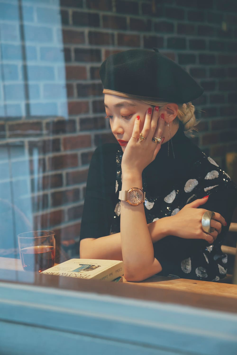 1つめの時計「GM-S110PG-4AJF」に続き、こちらもコンパクトサイズのメタルカバードシリーズの《G-SHOCK》。「GM-S2100PG-4AJF」は、比較的シンプルでミニマルなフレームデザインということもあり、ピンクゴールドIP処理が施されたメタルベゼルの上質な輝きをよりプレーンに味わうことができるはず。今回のmioさんのように、シックな装いにもスマートにマッチするモデルです。