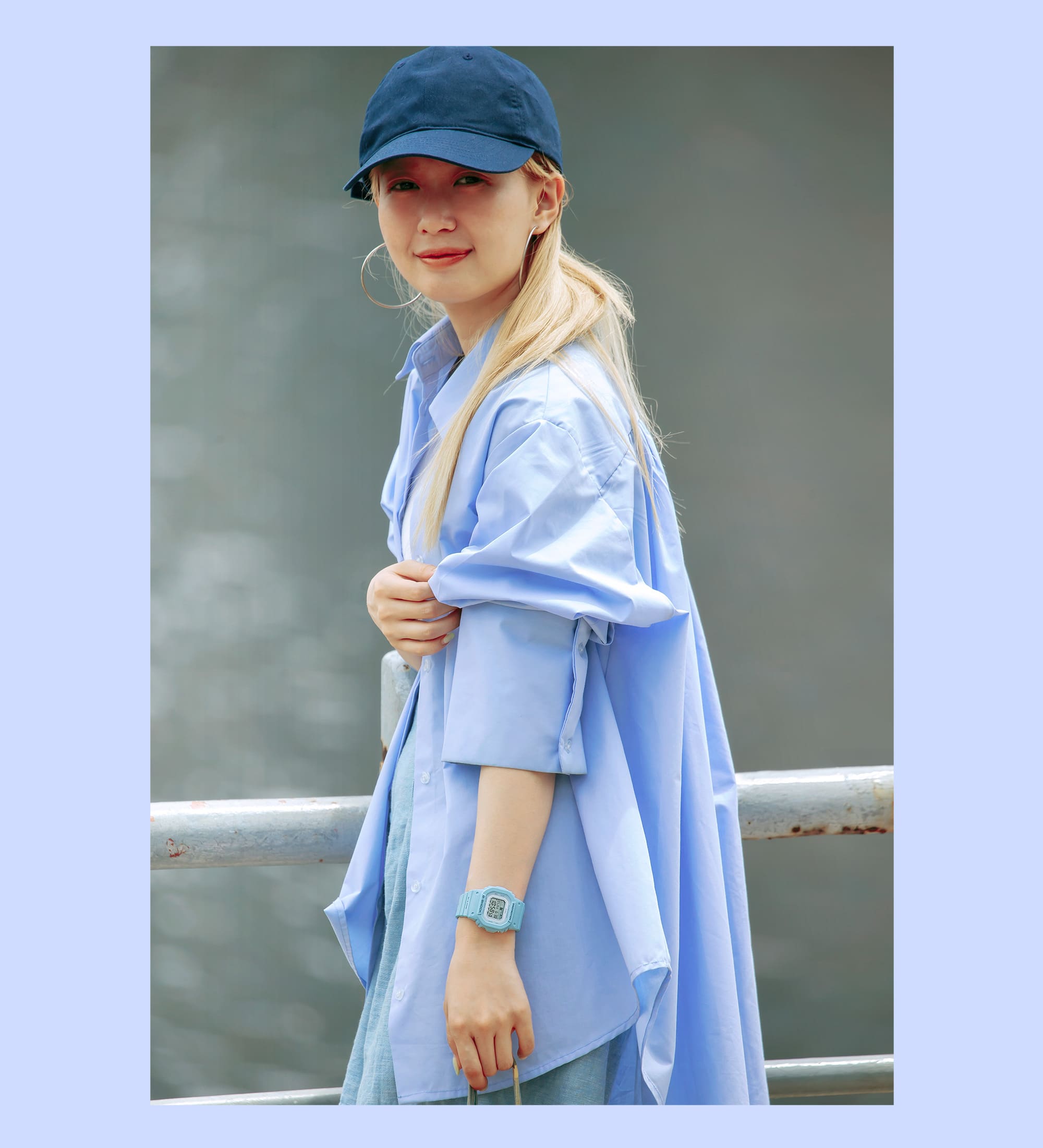今日は、みなとみらいの湾岸でお散歩中。“サーフトリップ”をテーマにデザインされたライトブルーの《G-SHOCK》との出会いで、ちょっぴり新鮮なサーフカジュアルにもトライしてみたという柴田さん。手元を飾る《G-SHOCK》を筆頭に、キャップにシャツにショートパンツ、それぞれのアイテムで異なるブルーを取り入れて、それを上手に組み合わせたスタイリングテクニックはさすが。ちょっぴりトラッド感もあって、“海辺のグッドガール”と呼びたくなるような着こなし。