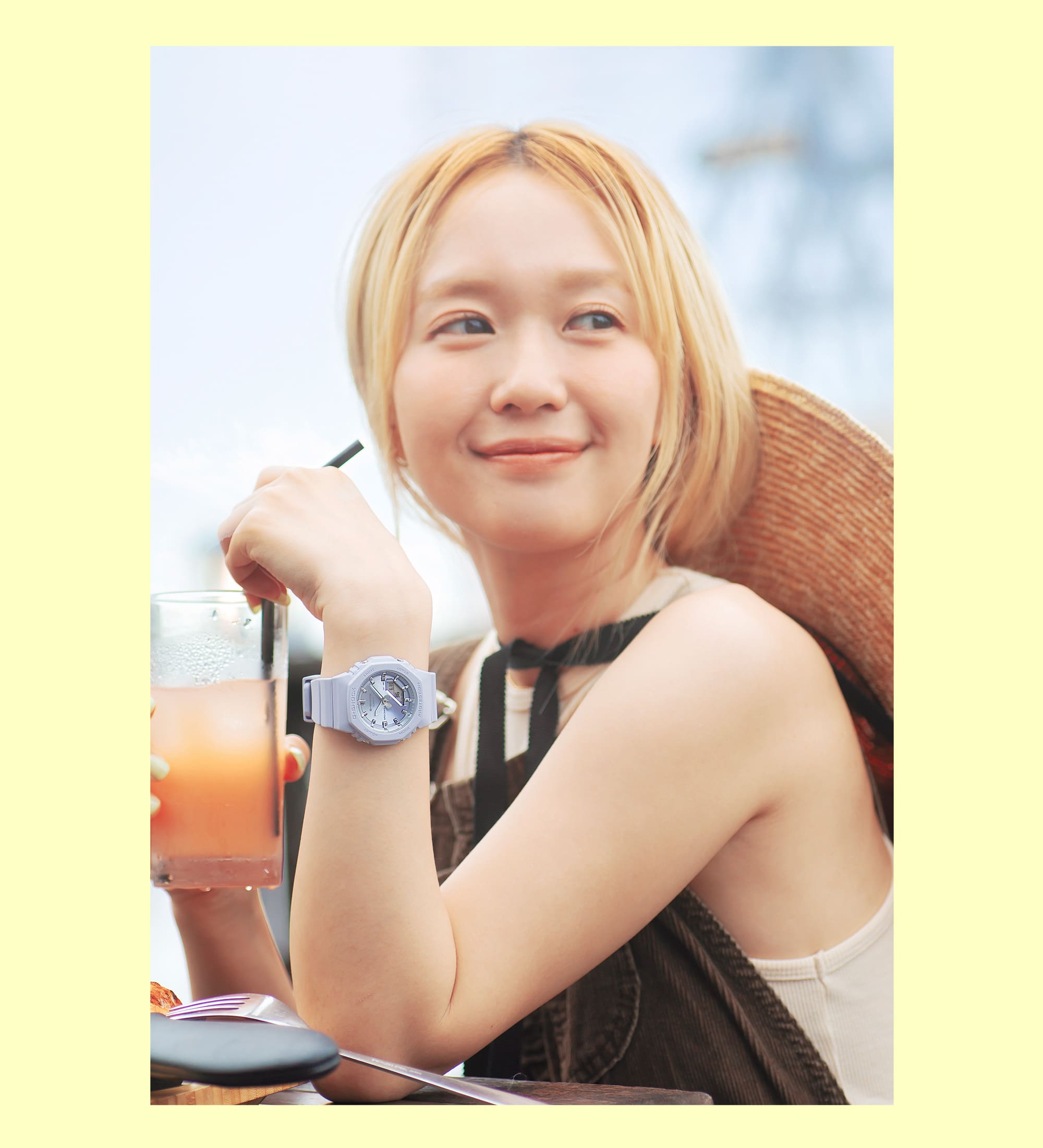 《G-SHOCK》の淡いパープルとオーバーオールのブラウン、この色の組み合わせが彼女のお気に入り。リラクシーなカジュアルスタイルとも《G-SHOCK》は相性がいいみたい。あえてソフトな色のアイテムをスタイリングのポイントにする、というのもお洒落でかわいい!と、このたび大発見。夏気分を盛り上げるツバの広いストローハット、アイボリーのタンクトップといったベージュニュアンスのアイテムともエフォートレスにマッチしていていい感じ。