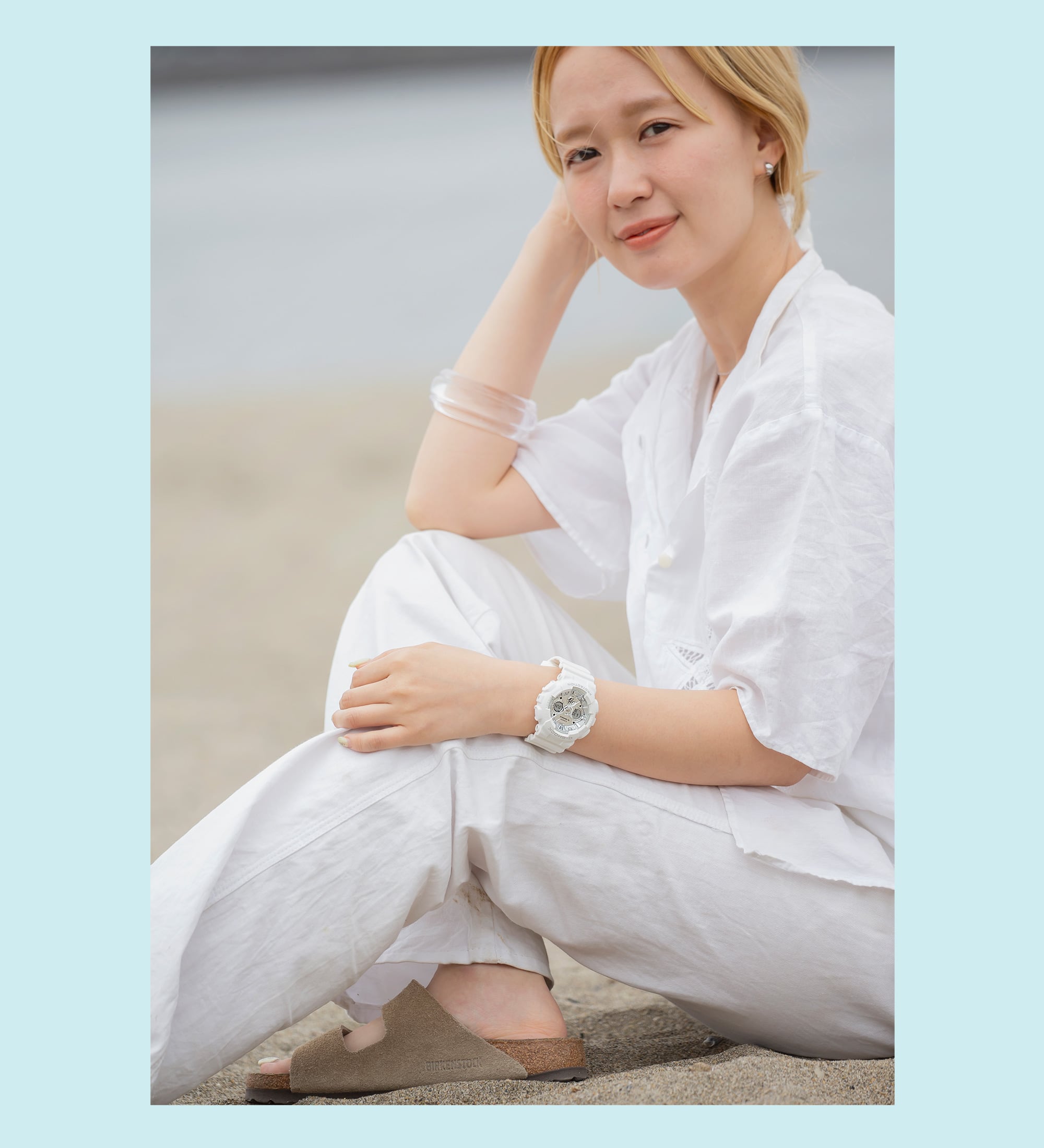 この日は、白を基調としたデザインの《G-SHOCK》に合わせた“オールホワイト”の装いで、静かな朝の砂浜へ。ヴィンテージライクな白いコットンのシャツとパンツを合わせたセットアップ風の着こなしに、心地よいアクセントを添える《G-SHOCK》。カジュアルだけど、どこか特別感もある夏の白は、潔くってクリーンで、なんだか気分がいい。