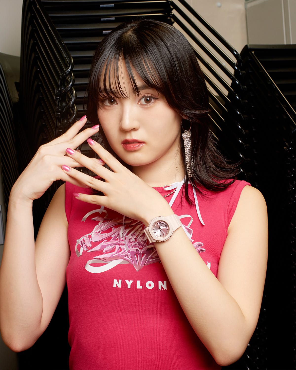 元々G-SHOCKの時計が好きなんです。今回は今までとは違う、少し小さめなものを着けさせていただきました。ピンクのカラーも今まで自分は着けたことがない色だったので、すごくうれしくて、見るたびに手もとがかわいいなってに思っています。