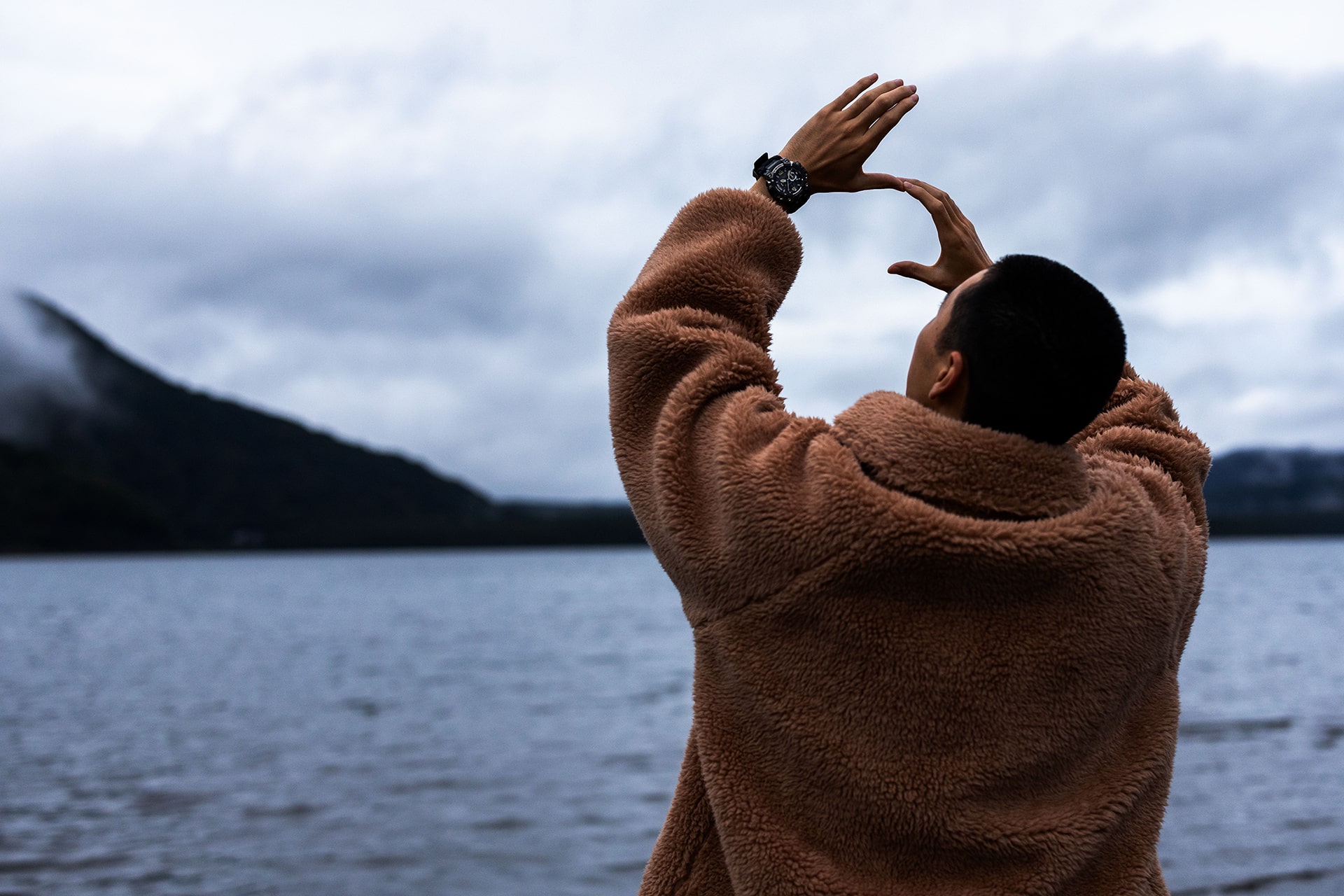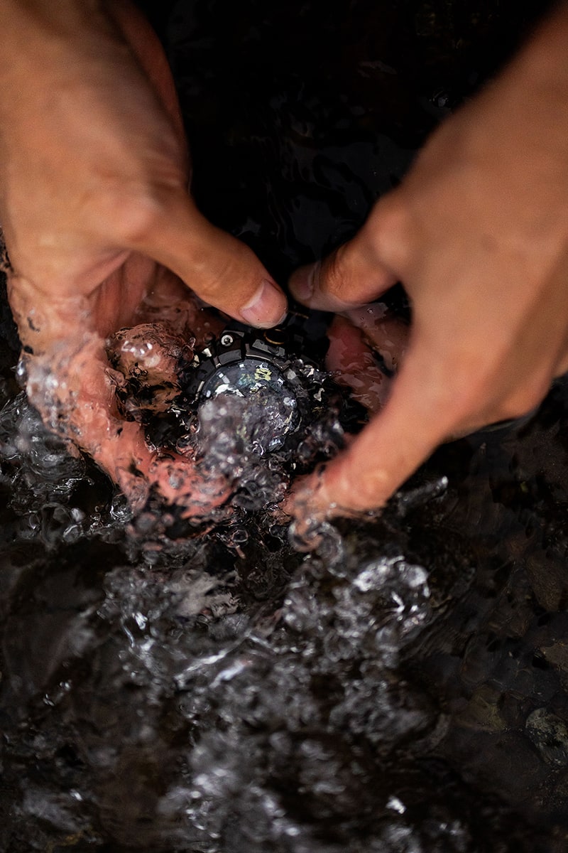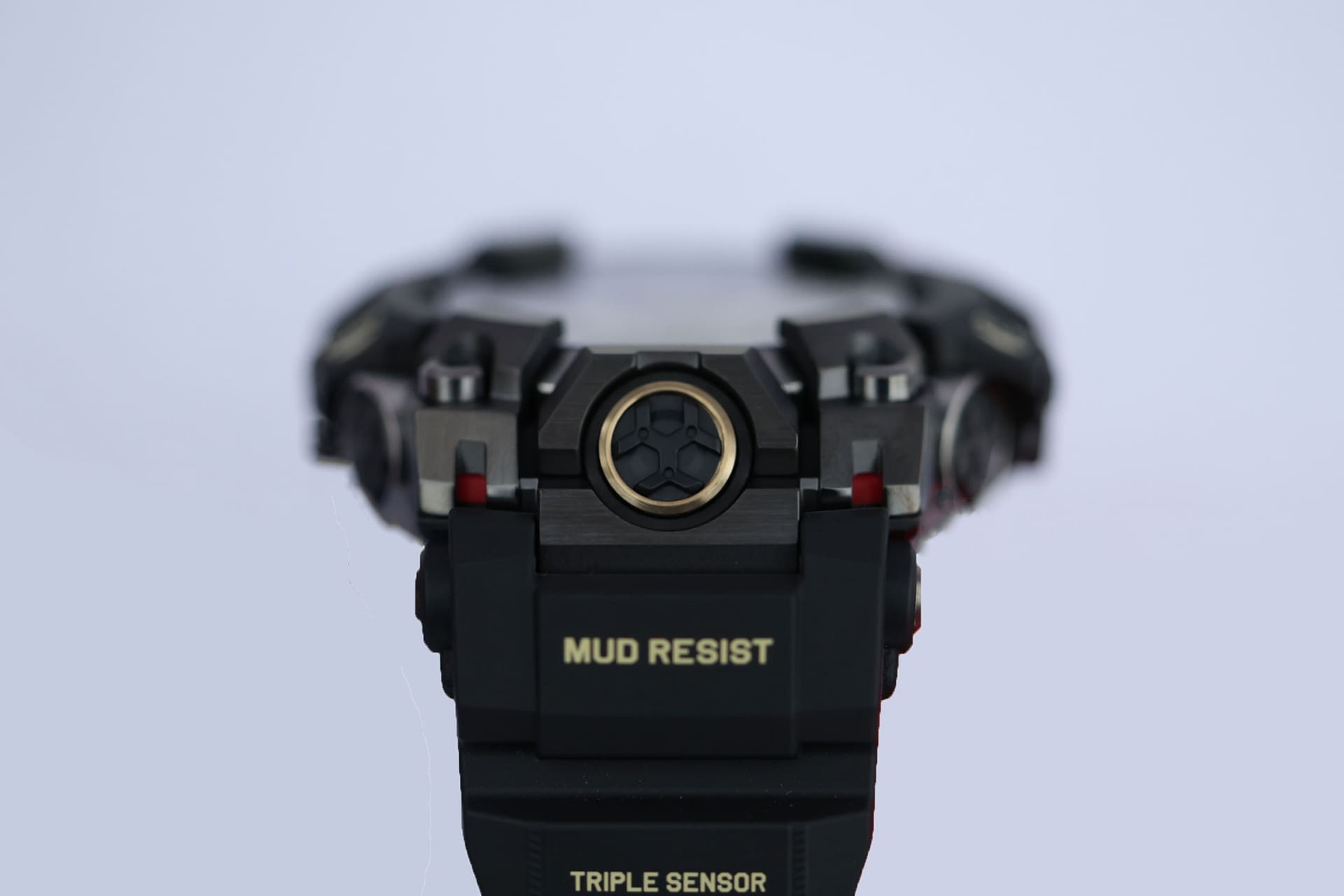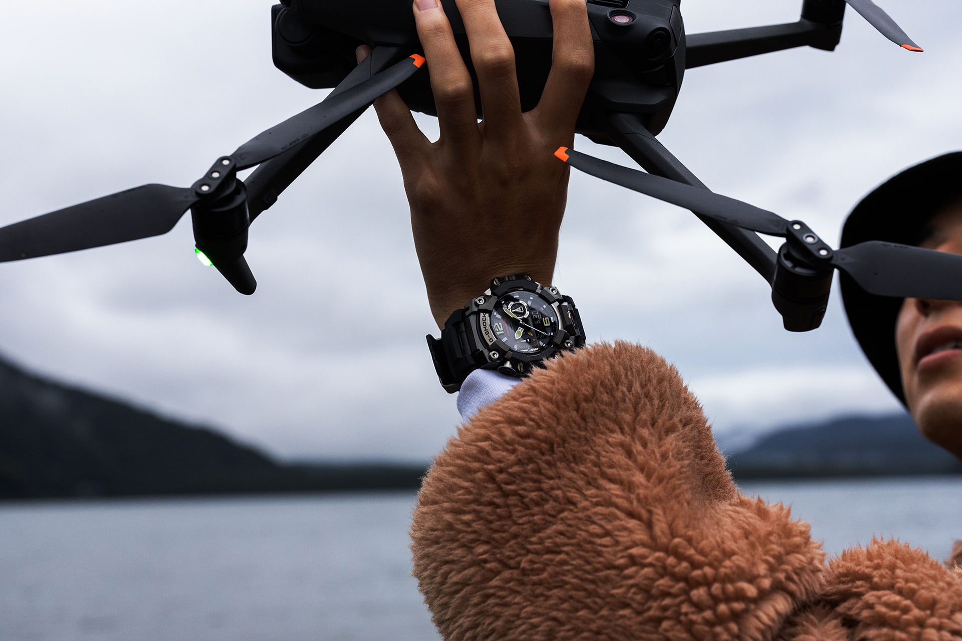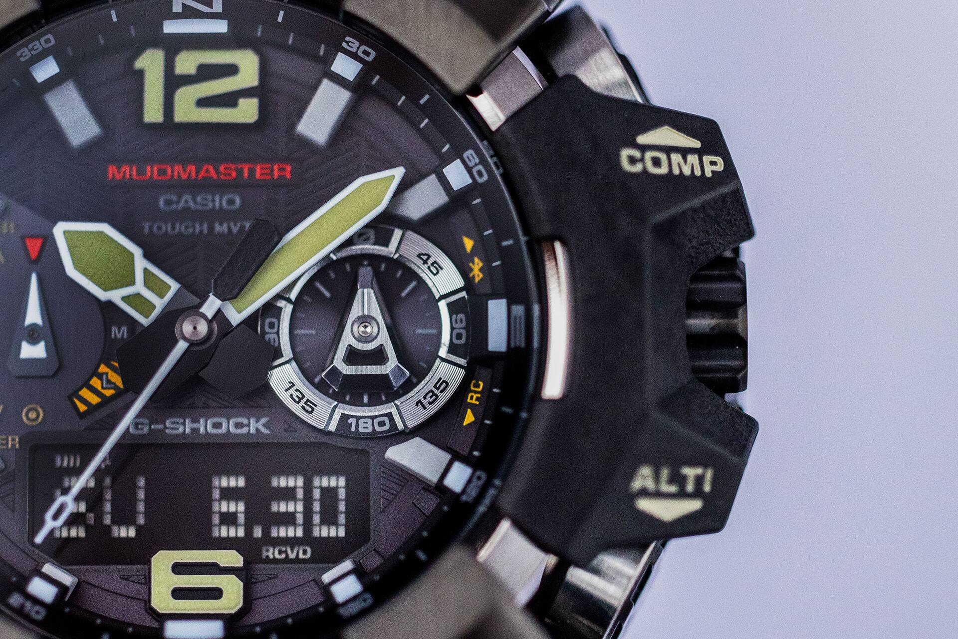もちろん、MASTER OF Gにラインナップされるマッドマスターだけに、このGWG-B1000も防塵‧防泥性能の点で突出していることは言うまでもない。遡ること1995年に誕生したマッドマンはプッシュボタンを覆うマッドレジスト構造によって防塵‧防泥性能を追求したモデルであり、ギアとしての確かな性能から、過酷なレースを走破するラリードライバーたちにも愛用されるようになった逸話もある。マッドマスターはその性能を継承しながらアナログ表示にこだわった上級機であり、この新作も過去モデルと比べるとパーツ構成は複雑にはなっているものの、水中や泥のなかで操作しても問題ないほどの高いスペックを維持している。時計をつけたままで川辺のアクティビティを楽しんだり、汚れがついた時計を湖畔で直接洗ったり……、というタフな使い方も可能というわけだ。