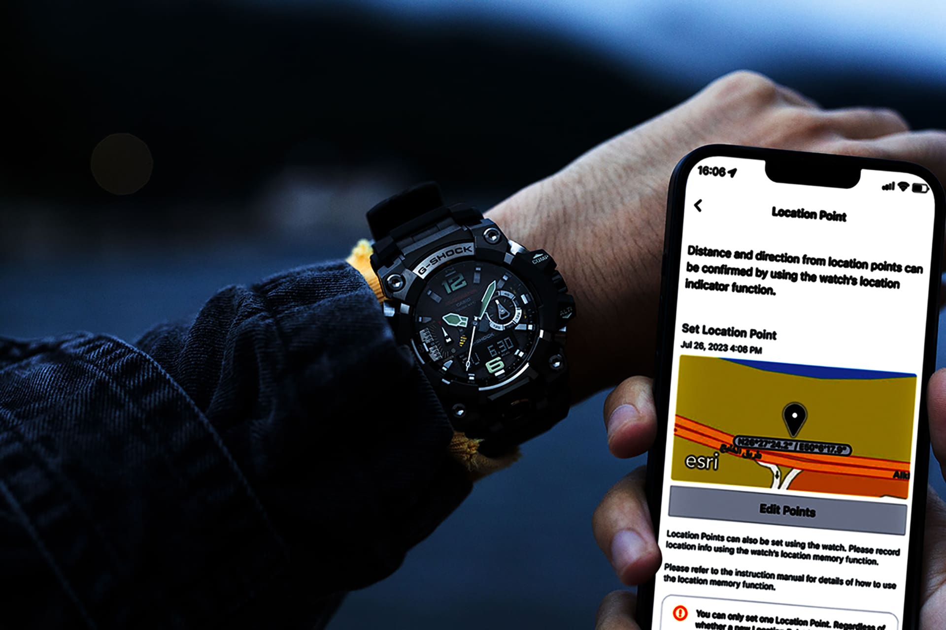 一見してインパクトを放つGWG-B1000がデザインモチーフとしているのは、オーバーランディング(旅自体を目的とする、車両による旅行)で使用される車両や各種ツールだ。外装にメタルパーツを新たに採用したことによって、GWG-1000以上にラギッドなルックスに仕上げられている。ブラックをはじめ、バリエーションとして用意されているくすんだ色調のグリーンやレッドなどのカラーリングもオーバーランディングで使用されるギアをイメージしたものだ。また、ハードな環境での使用に耐えるタフな外装設計はもちろん、内部のモジュールも進化を遂げており、トリプルセンサーを搭載した電波ソーラーモデルとしては初めてBluetoothに対応した。これまでも時計単体でデータを取得することはできたが、それをスマートフォン上でデータとして残したいというユーザーからの要望があったのだという。新たに搭載されたロケーションインジケーター機能により、スマートフォンとの連携で目的地を3時位置のコンパスで指し示したり、行程のログを残したりすることも可能となった。車はもちろん、自転車の運転中にも手元でさっと方角を確認できるのは大きなメリットだろう。さらに、タフソーラー機能によって駆動時間の懸念も解消しているなど、行き先に縛られない気ままな旅をサポートする頼れるパートナーに仕上げられている。