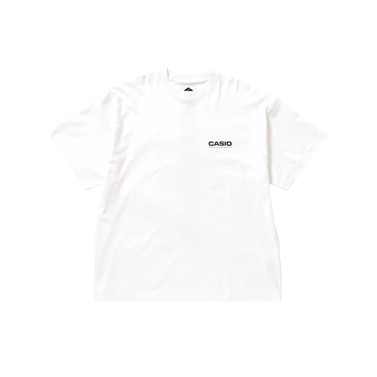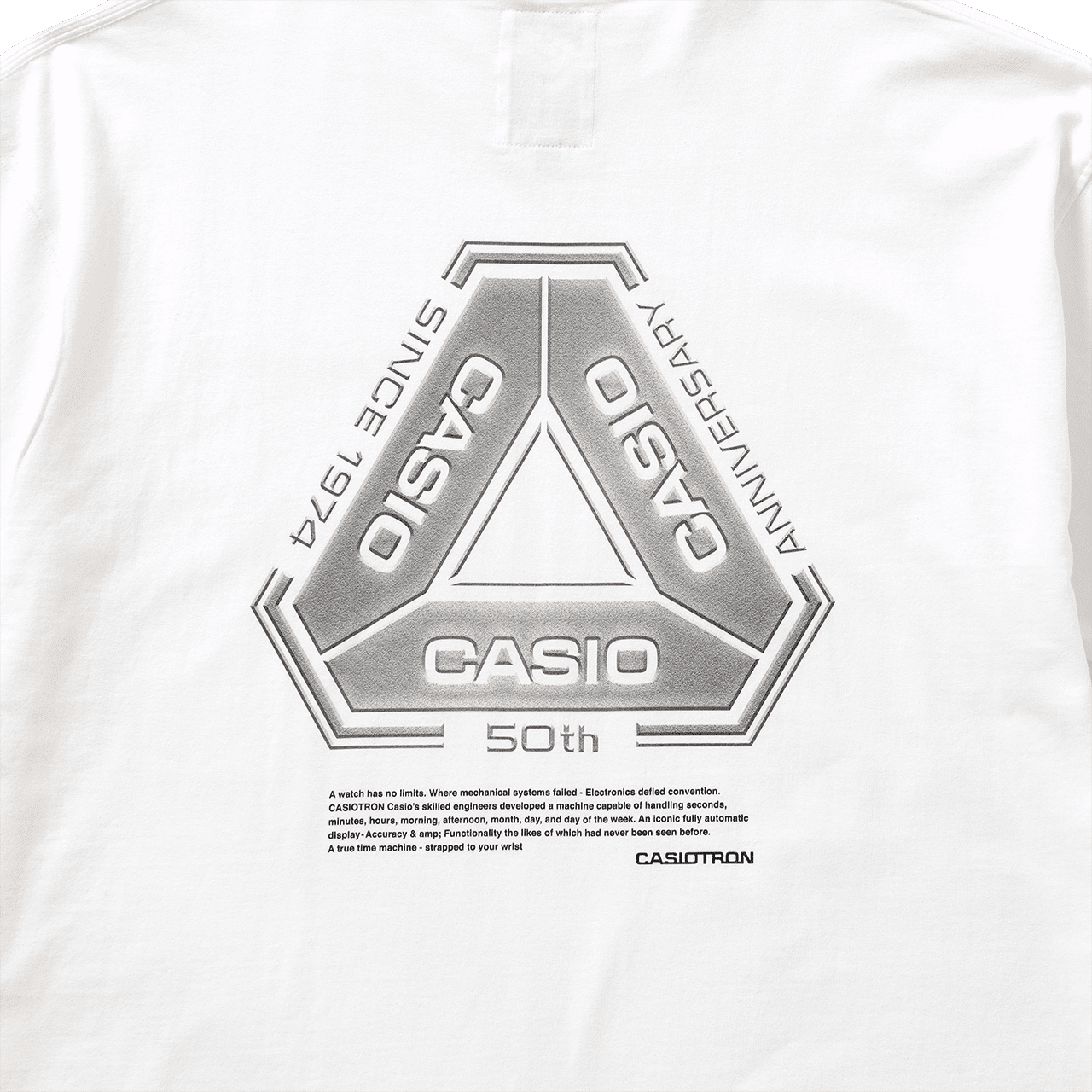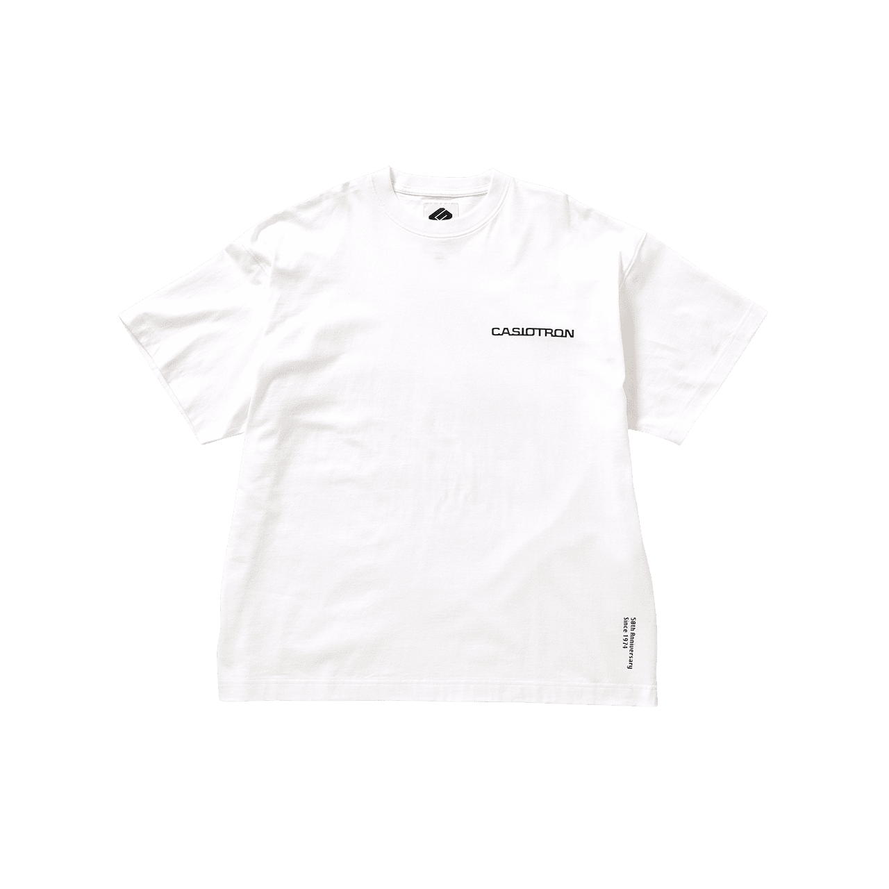 カシオ初の腕時計である「CASIOTRON」からインスパイアされたオリジナルデザインTシャツ。フロントには「CASIOTRON」ロゴを、バックプリントには時計の裏蓋にデザインされたグラフィックや発売当時の新聞広告に掲載されていた 「デジタル時計として世界初のオートカレンダー機能」についてのテキストを落とし込みました。サイジングは過去の“G-SHOCK PRODUCTS”でも好評を博した適度なルーズシルエットを採用。カシオ時計事業50周年の節目だからこそ実現した、国内数量限定のコレクタブルなアイテムです。