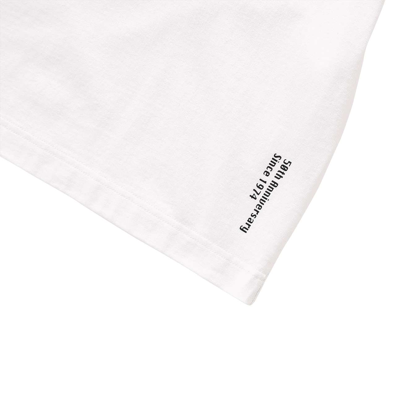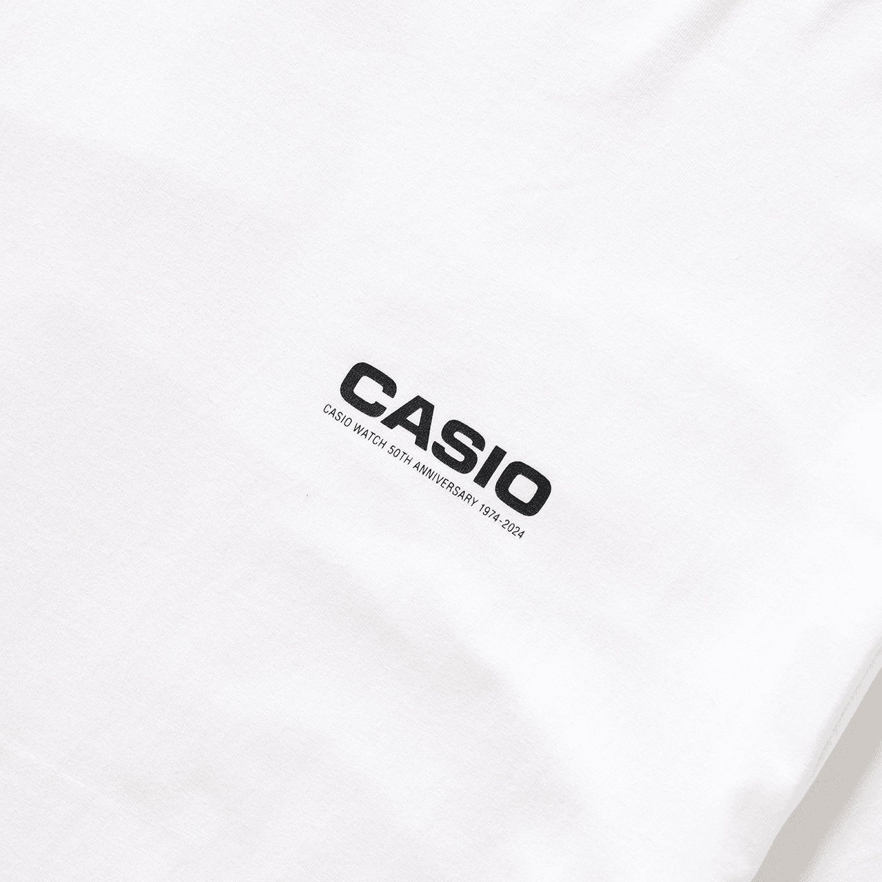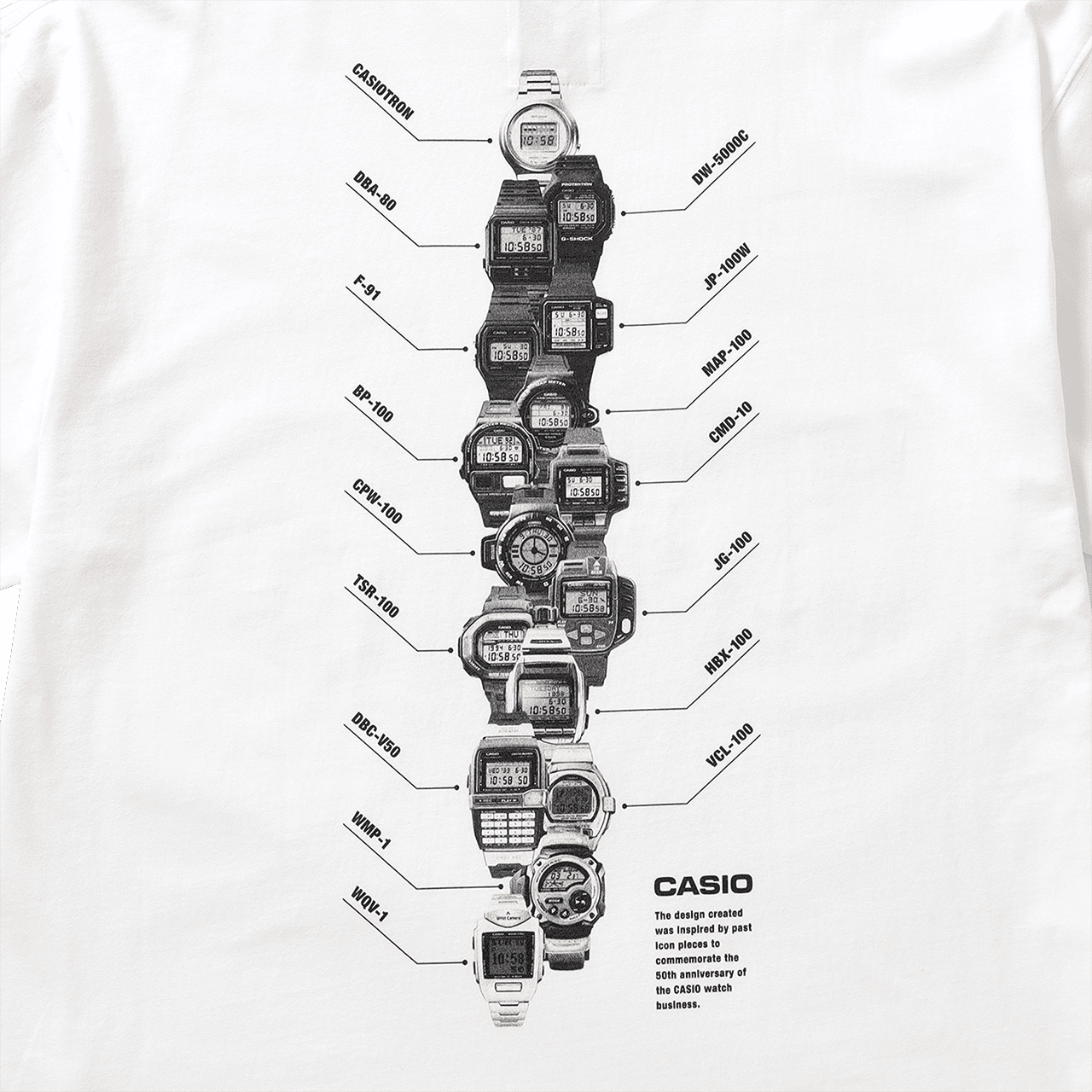 カシオ時計事業50周年を記念したオリジナルデザインのTシャツ。これまでカシオが世に生み出してきた腕時計の中から選んだ16モデルの独特な造形美を一つのグラフィックデザインに昇華させ、バックプリントに落とし込んだスペシャルなデザインです。フロントにはアニバーサリーイヤーを象徴させる「CASIO」ロゴを配し、サイジングは過去の“G-SHOCK PRODUCTS”でも好評を博した適度なルーズシルエットを採用しました。カシオ時計事業50周年の節目だからこそ実現した、国内数量限定のコレクタブルなアイテムです。