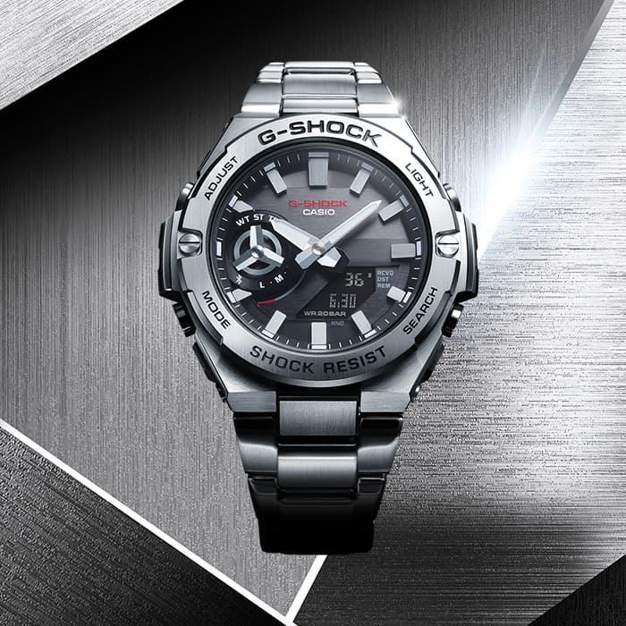 ステンレス製のベゼルとガラス繊維強化樹脂製のインナーケースでモジュールを保護。G-SHOCK初号機のデザインコンセプトを受け継ぐアイコニックな八角形ベゼルを、手間のかかる鍛造・切削・研磨加工を経て成形。天面を円周ヘアライン、側面をミラー研磨で美しく仕上げました。