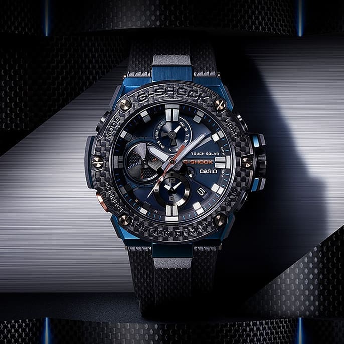 透過印刷による縦長のグリッドパターンと円周のヘアラインの組み合わせが、液晶やインダイアル部の立体感を強調。モダンな表情を醸し出します。ブルーとグリーンのモデルは蒸着処理でメタリックな質感に仕上げました。立体形状のインデックスに蒸着処理と蓄光処理を施し、暗所での視認性を向上しています。