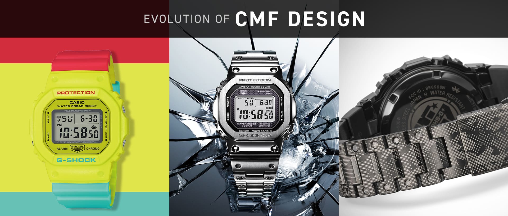 インナーケースの素材をメタルからグラスファイバー強化樹脂に変更。強さと軽さ、加工性に優れた特性を生かし、より柔軟な設計や実装を可能にすることで、多機能モジュールの搭載や外装デザインの自由度を向上。ライト、電波ソーラー、Bluetooth®など、その後のG-SHOCKの進化を支えるベース構造を確立しました。