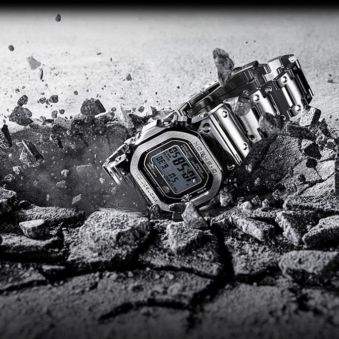 G-SHOCKの耐衝撃基準をメタル外装でクリアし、強さと美しさを同時に実現。鍛造成形のベゼルケースとセンターケースを高い嵌合精度で組み合わせ、両パーツの間にファインレジン製の緩衝材を実装。微細な突起が圧迫される際の反発力で衝撃を緩和します。