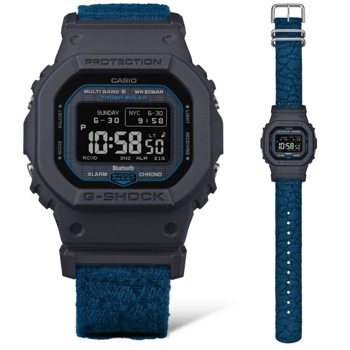 地球環境について考え行動するアースデイのビジョンに、G-SHOCKが取り組むサステナブルな素材や機能で応えた限定モデルです。クロスバンドに、海洋汚染の要因として問題視されている廃漁網を加工したリサイクル素材を採用。水面をイメージしたデザインに仕上げました。主な樹脂パーツにバイオマスプラスチックを使用し、光で動き続けるタフソーラーも搭載。自然との共生を形にした環境テーマモデルです。