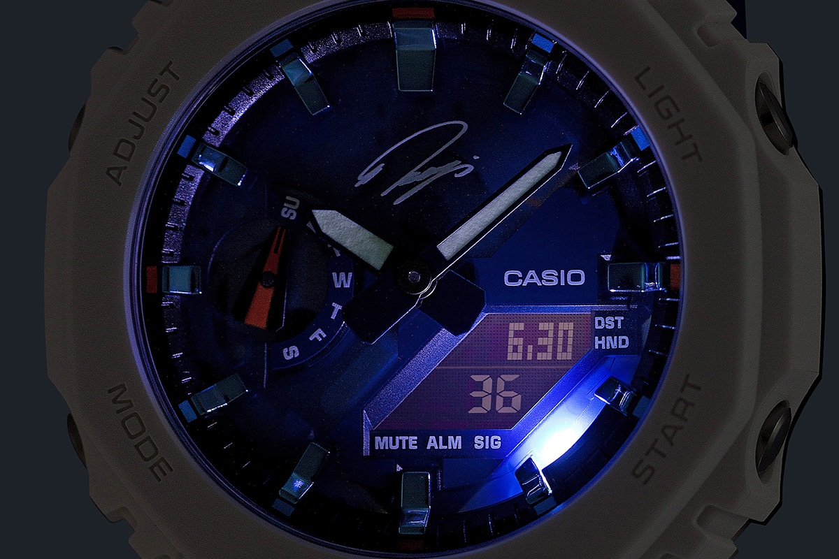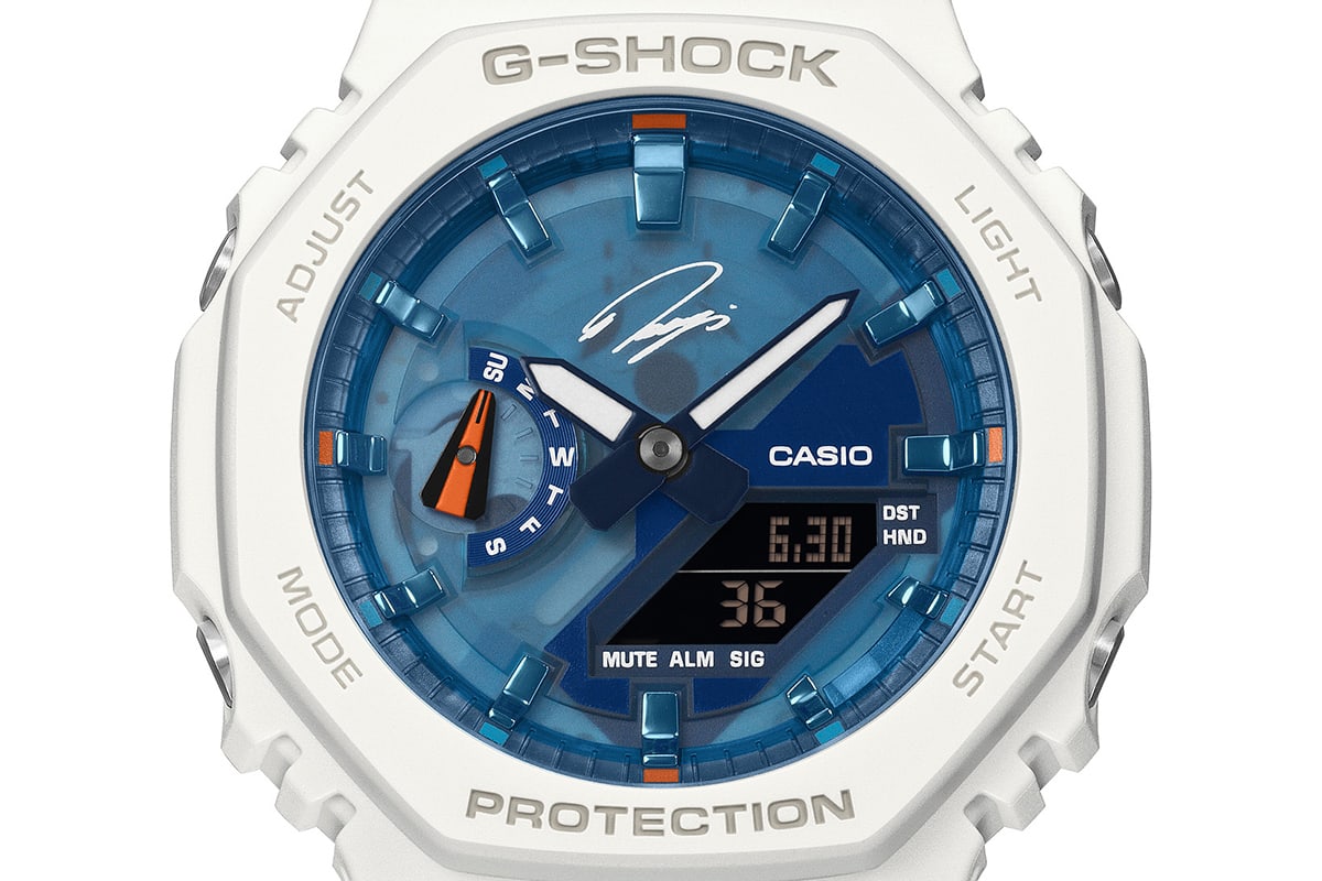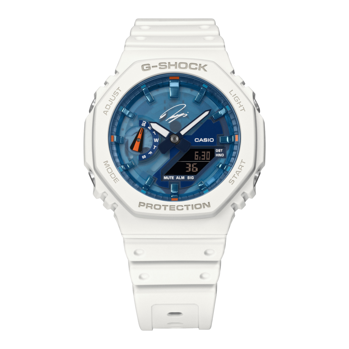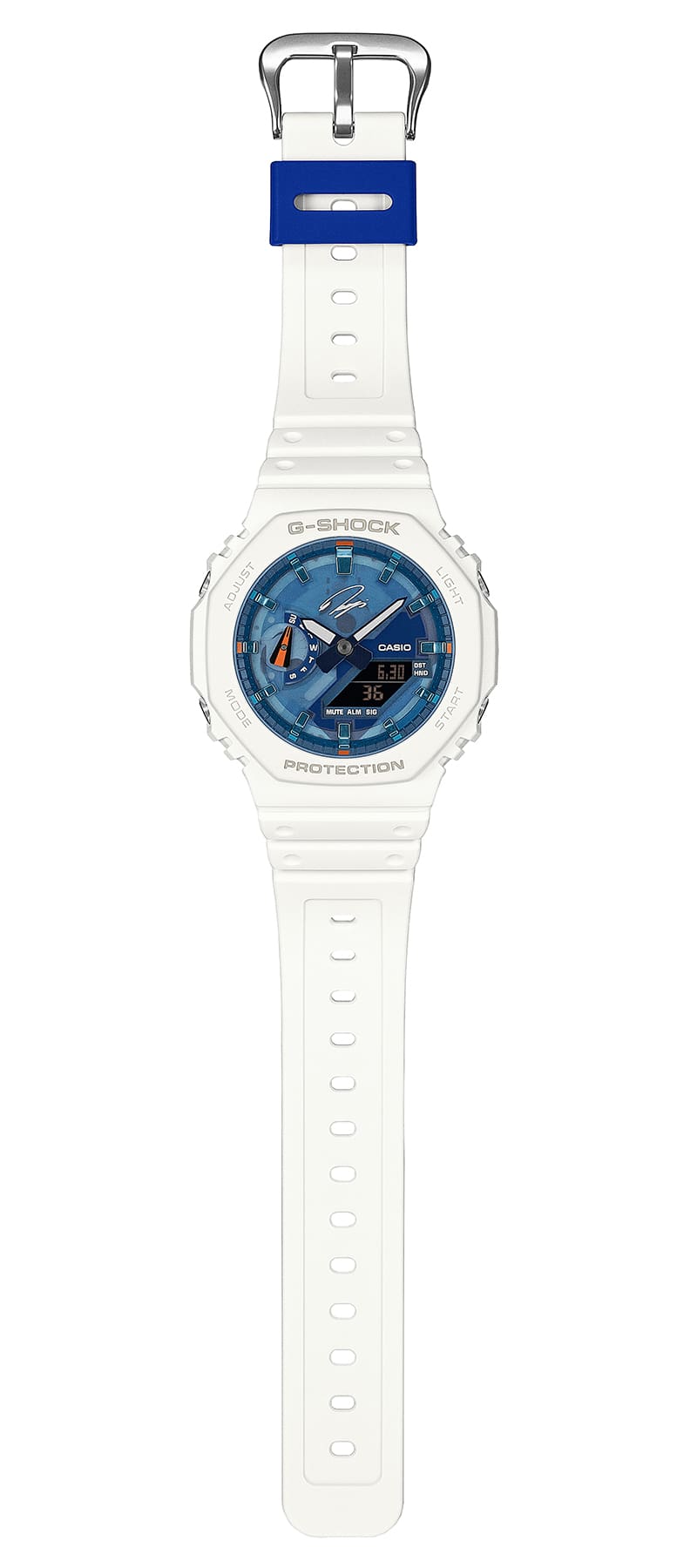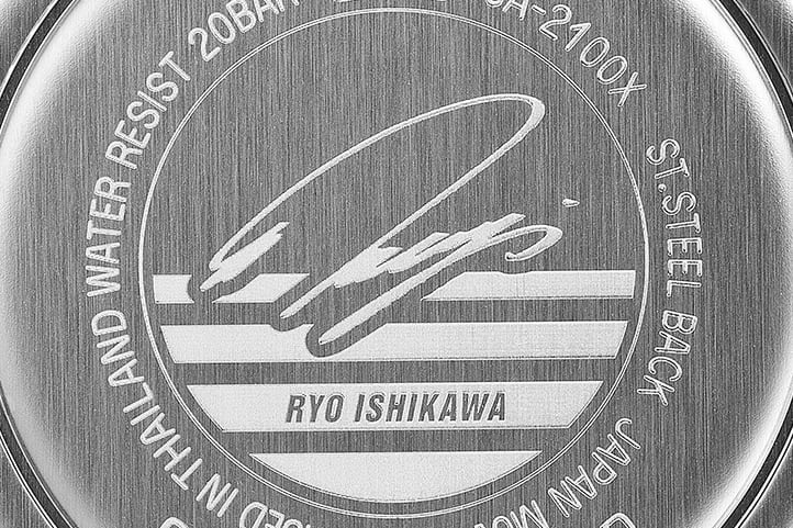 CASIO所属、プロゴルファー石川遼選手のシグネチャーモデル第5弾です。ベースモデルはオクタゴンベゼルのGA-2100で、ゴルフスイング中も邪魔にならない薄型ケースを採用。文字板には闘志を秘めた冷静のブルー、全体は潔さと覚悟を表すホワイト、差し色には希望を意味するオレンジを配色し、どんなゴルフウェアにも合わせやすいカラーリングに仕上げました。また、文字板はスケルトンを採用することで、今までにない印象的なデザインとなっています。石川遼選手のサインを12時位置と裏蓋に施し、トレーディングカードが付属したスペシャルパッケージと合わせ、特別な仕様となっています。